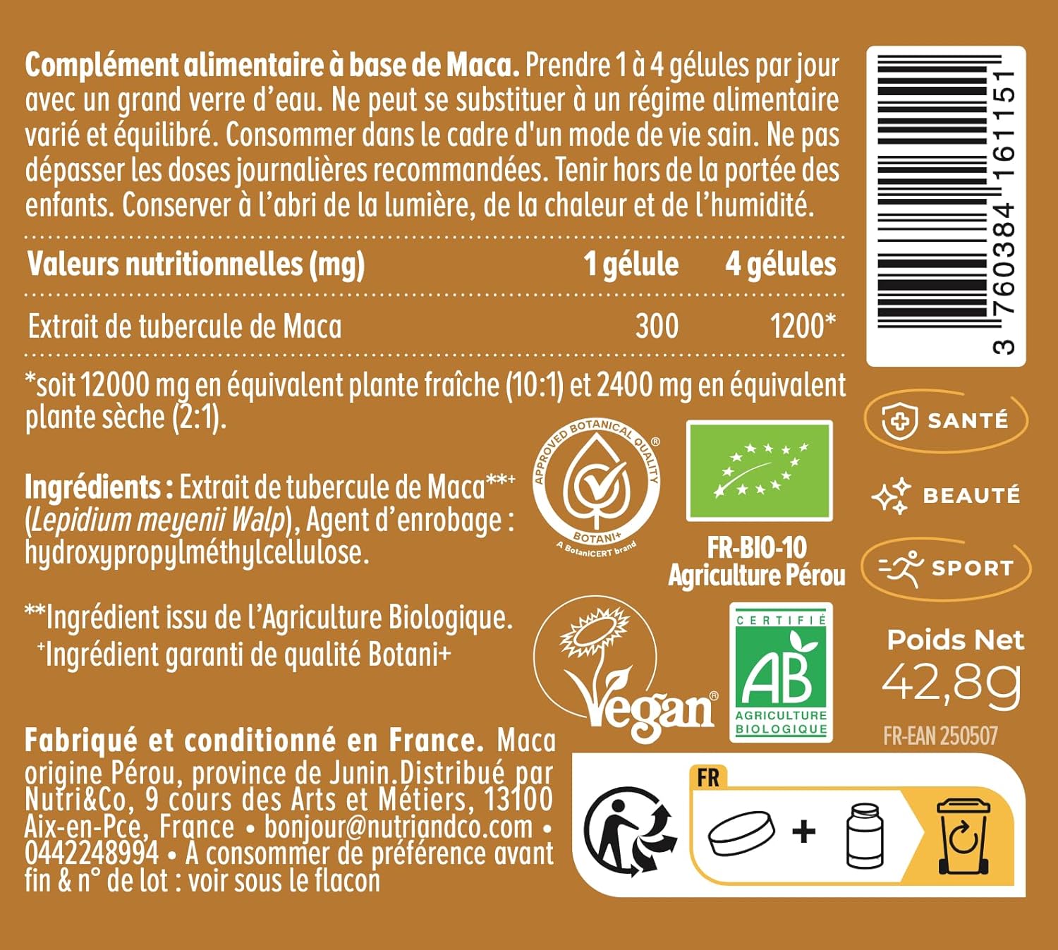 NUTRI & CO Organic Black Maca from Peru High Dosed 10:1 – 100% Pure Natural Extract Botani+ Labeled – Strength, Energy, Hormonal Balance – 120 Vegan Capsules – Made in France
