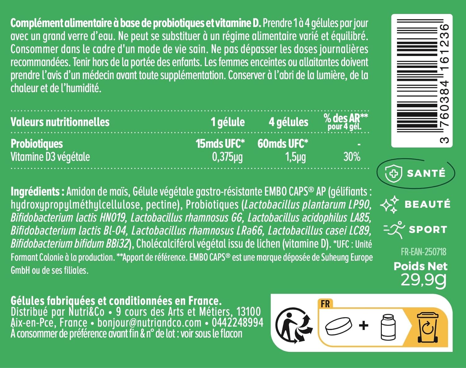 NUTRI & CO TRANSPARENCE – Our capsules contain no magnesium stearate, soy or gluten and are suitable for vegans. Our lactic ferment producers, Danisco & WeCare Probiotics, are in Denmark and China. Embo Caps are made in South Korea. Our Intestinal Flora Probiotics are encapsulated in the Exden Laboratory in Carquefou, France.