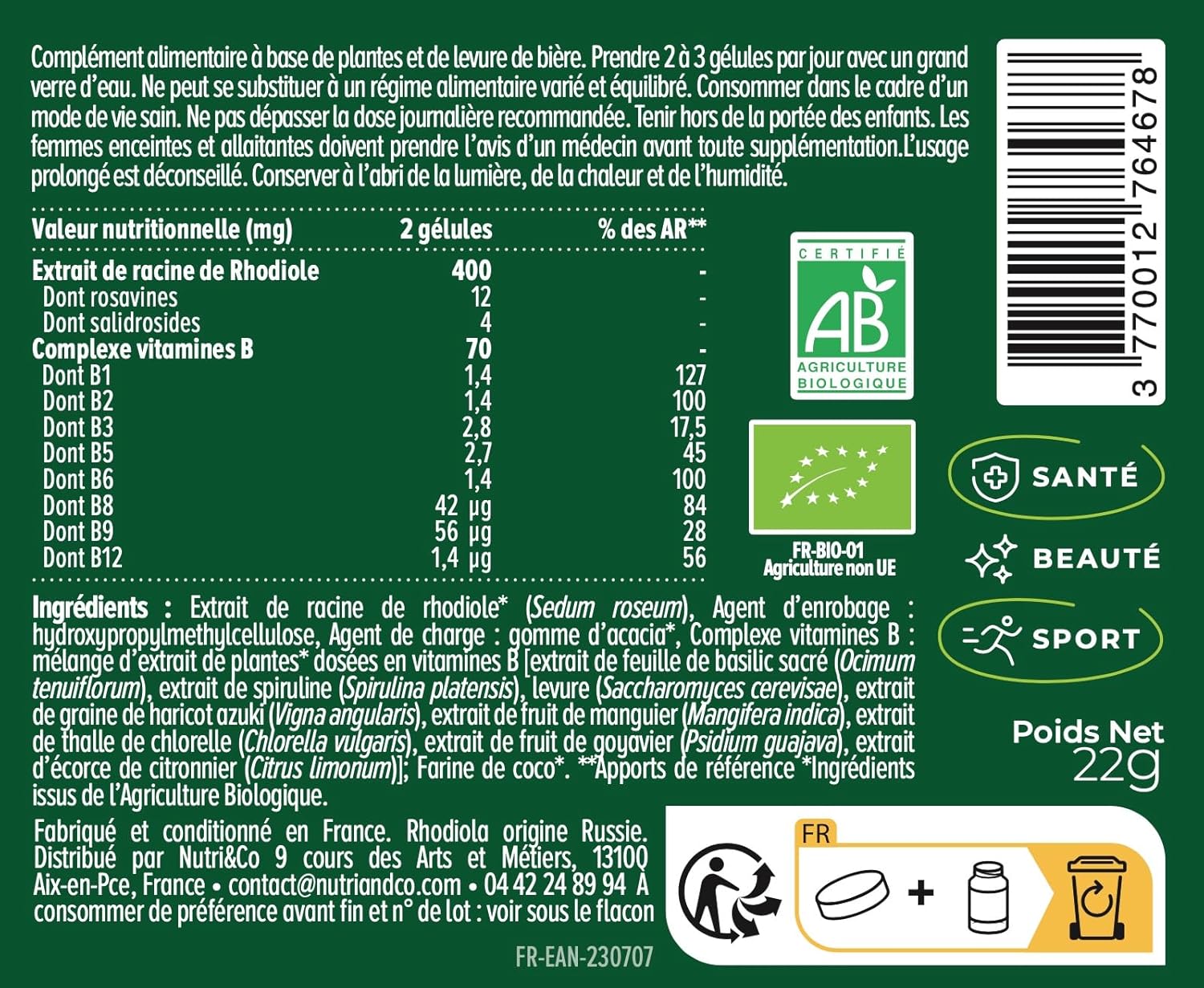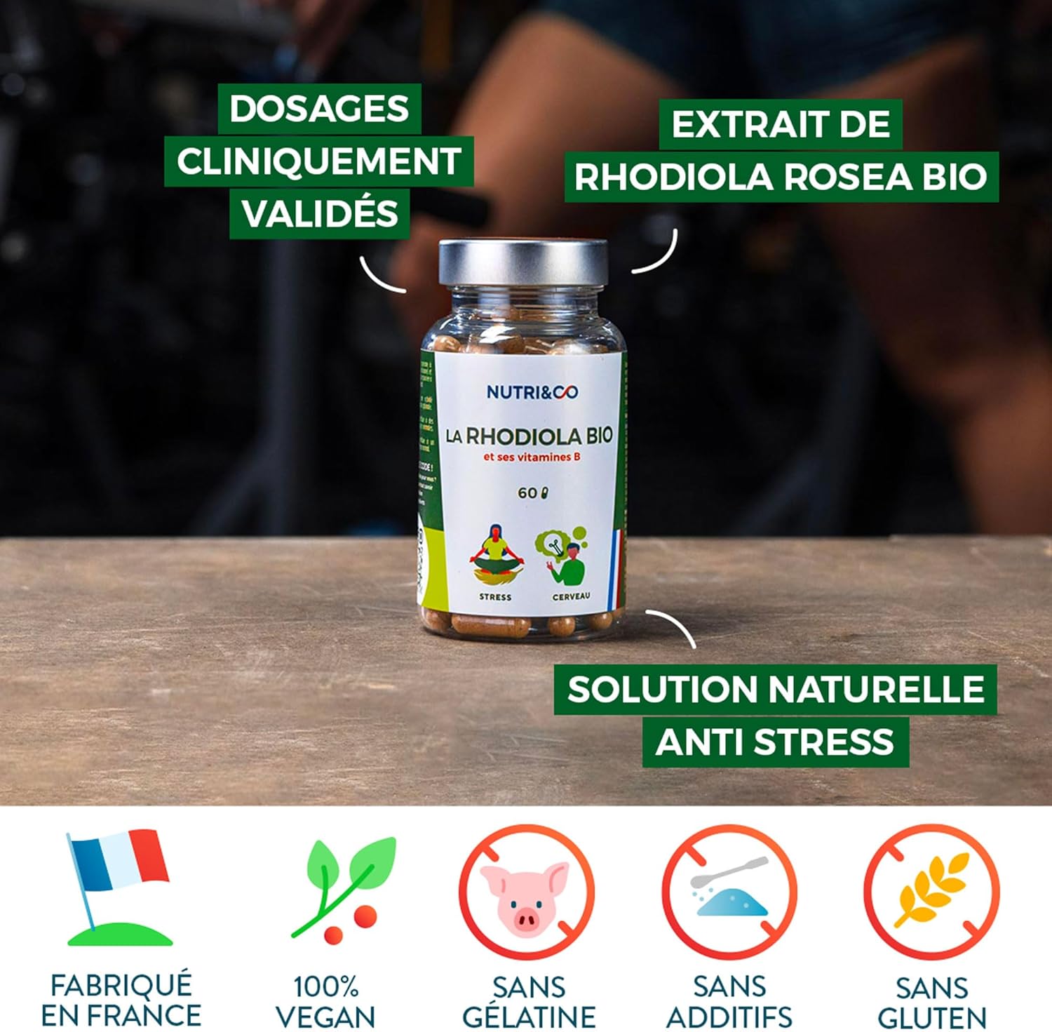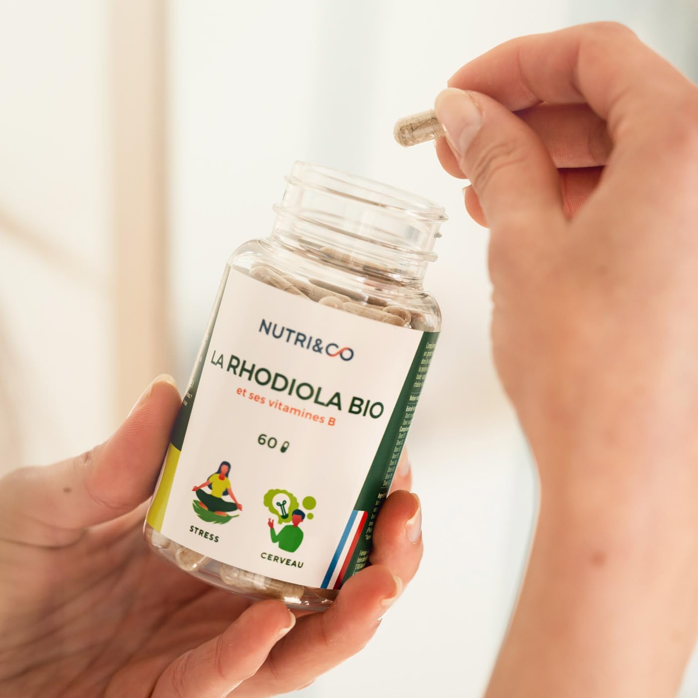 NUTRI & CO Rhodiola Rosea Organic – 100% Natural Extract Titled in Rosavine & Salidroside + Vitamin B Complex – Natural Anti-Stress Dietary Supplement – 60 Vegan Capsules Made in France