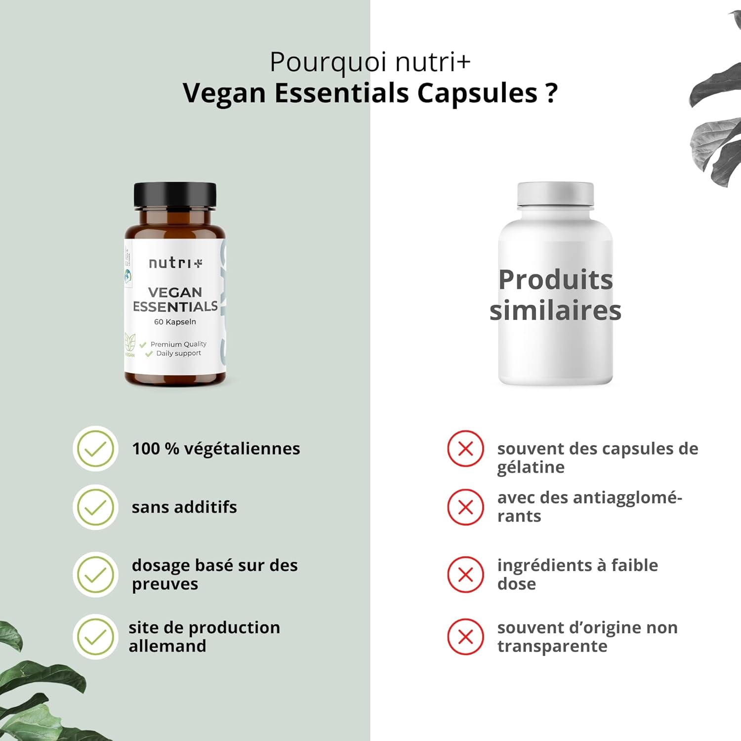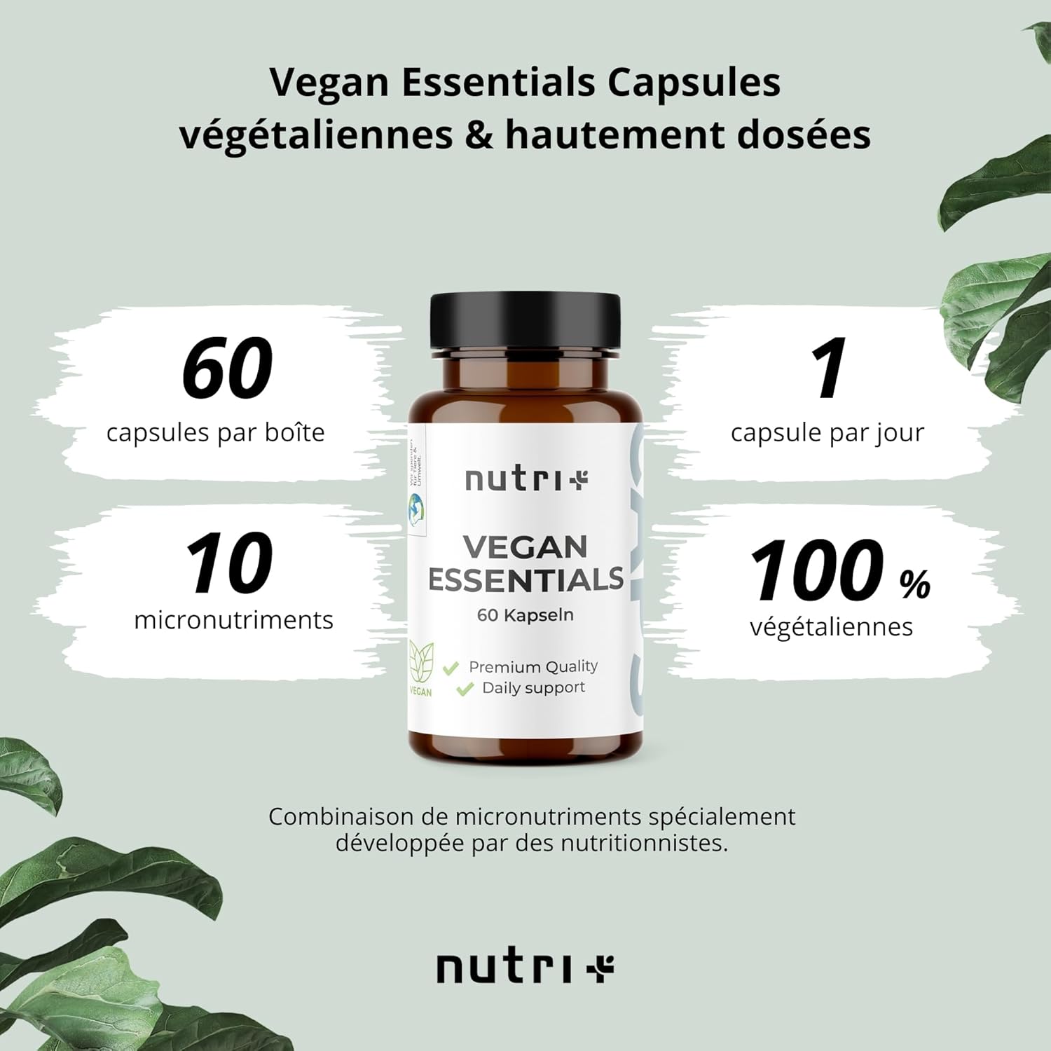 Notre nutri+ Vegan Essentials Capsules est un complément alimentaire destiné à soutenir les personnes qui suivent un régime végétalien ou végétarien. En effet, le fait de ne pas consommer d’aliments d’origine animale peut augmenter le risque d’un apport insuffisant en certains nutriments.