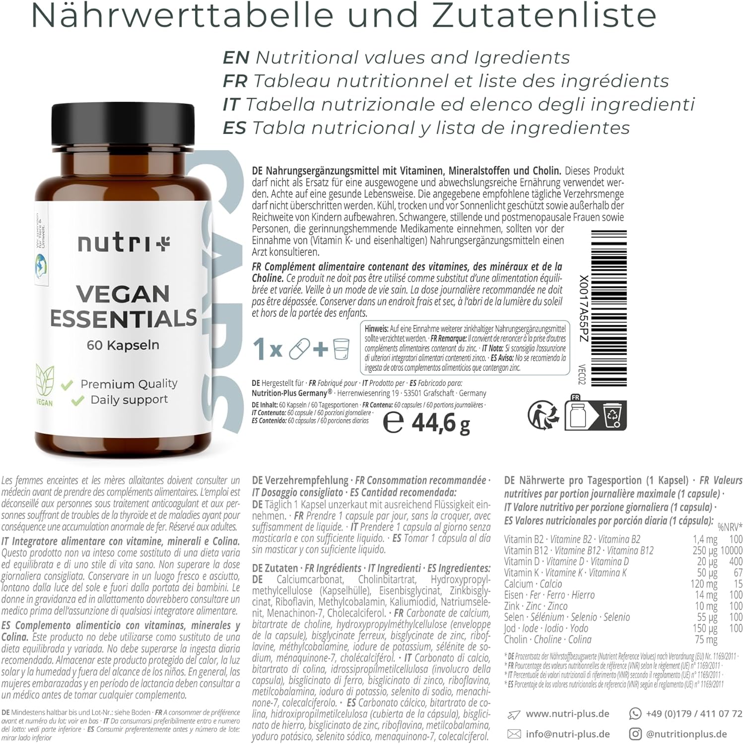 60 capsules hautement dosées et faciles à avaleridéal en cas d’alimentation végétalienne ou végétarienneavec 9 vitamines et minéraux importants ainsi que de la cholineavec des vitamines B2, B12, D et K2 ainsi que du zinc, du fer, du calcium, du sélénium, de l’iode et de la choline