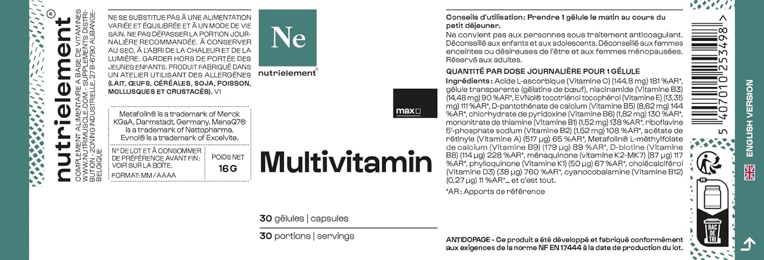 DOSAGE and TIPS – Take one capsule in the morning, during a meal, ideally in the morning. A true ally of well-being, the Multivitamin will allow you to cope with the changes of seasons by helping to strengthen the immune defenses. We recommend that you take the Multivitamin Nutrielement with the Nutrient Multimineral, for an additional intake of minerals.