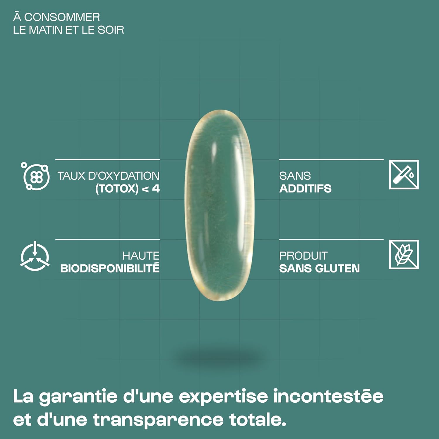 EPA/DHA balance: Omega 3 essential fatty acids are lipids mainly derived from fish fats. Nutrielement omega 3 respect EPA/DHA balance in order to obtain a complete intake. Our Omega 3 has a very low oxidation index (<4) which is well below the maximum limit of 26 which makes it a product of an unparalleled peaker.