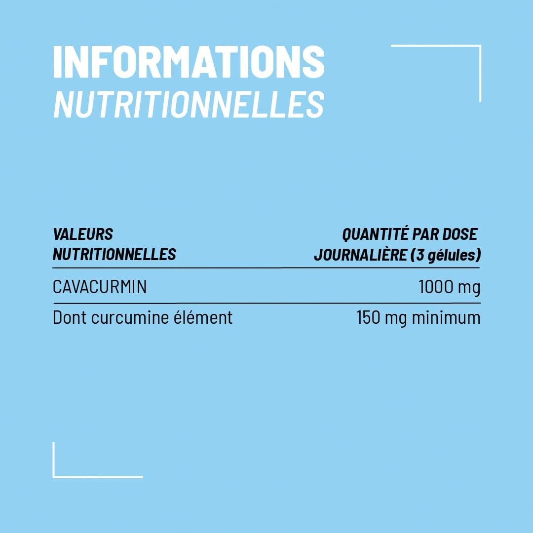 Thanks to its water-solubility, Active Curcumin is 39X more bioavailable than a Curcumin extract 95%. Thus 3 capsules (1000mg of Cavacurmin) is equivalent to 39 g of curcumin extract contained in 1 kg of fresh turmeric. So, 1 g of Active Curcumin equals 1 kg of fresh turmeric, without digestive problems!