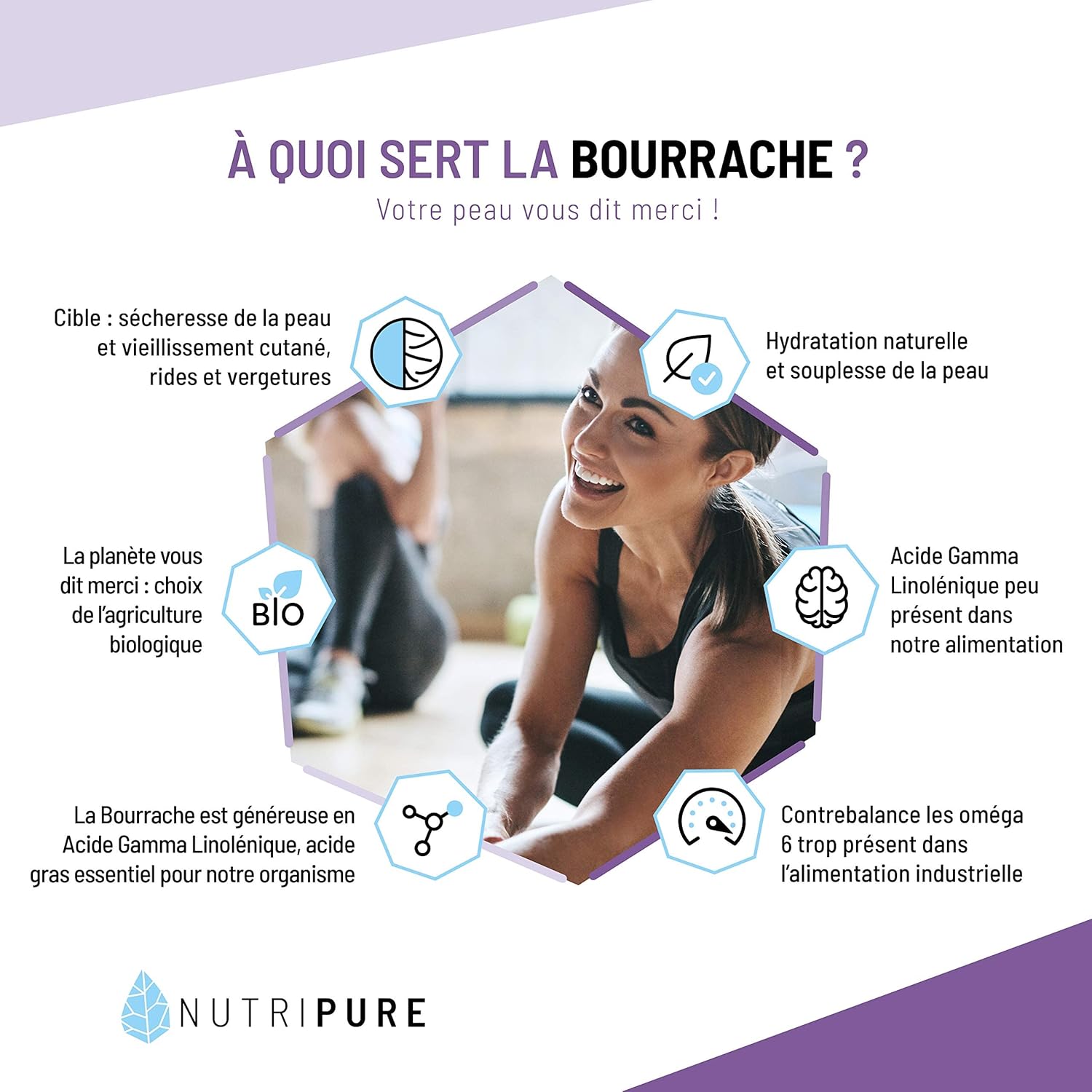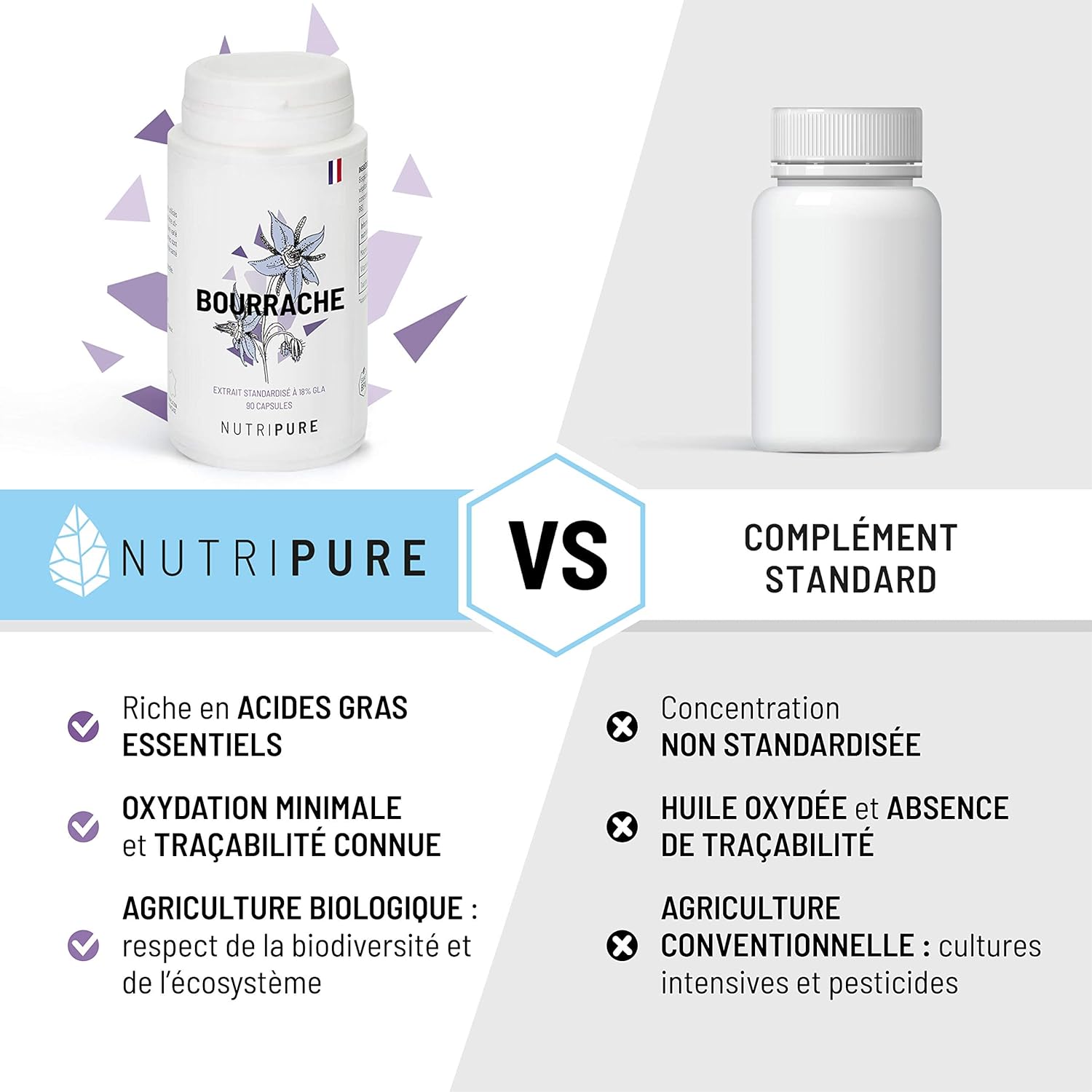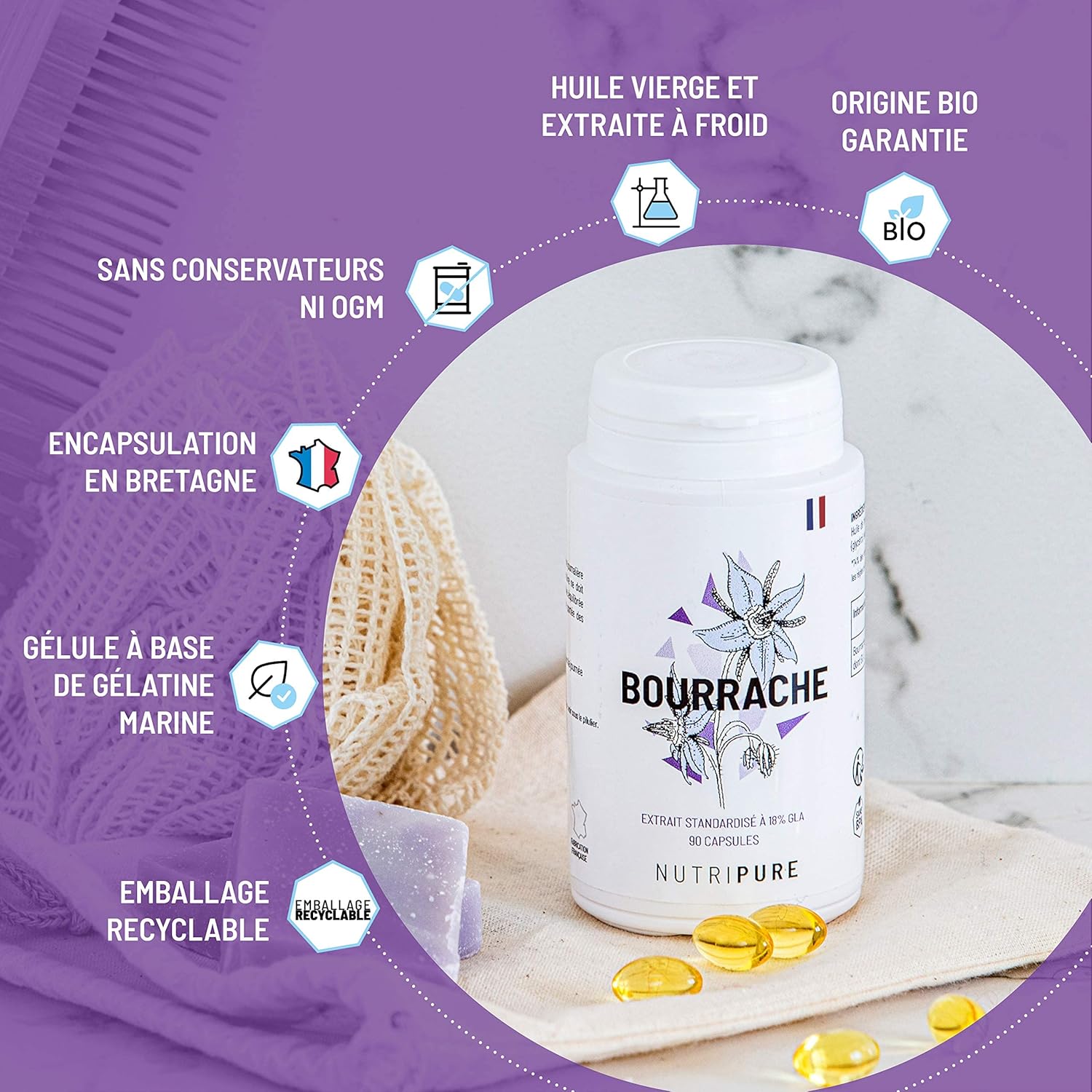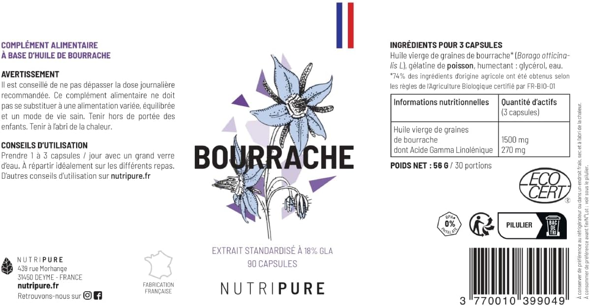 Nutripure | Organic Borage Oil | Natural Hydration and Skin Flexibility | Cold Extracted Virgin Oil | Rich in Gamma Linolenic Fatty Acid | 90 Capsules 500mg | 1 Month | Made in France