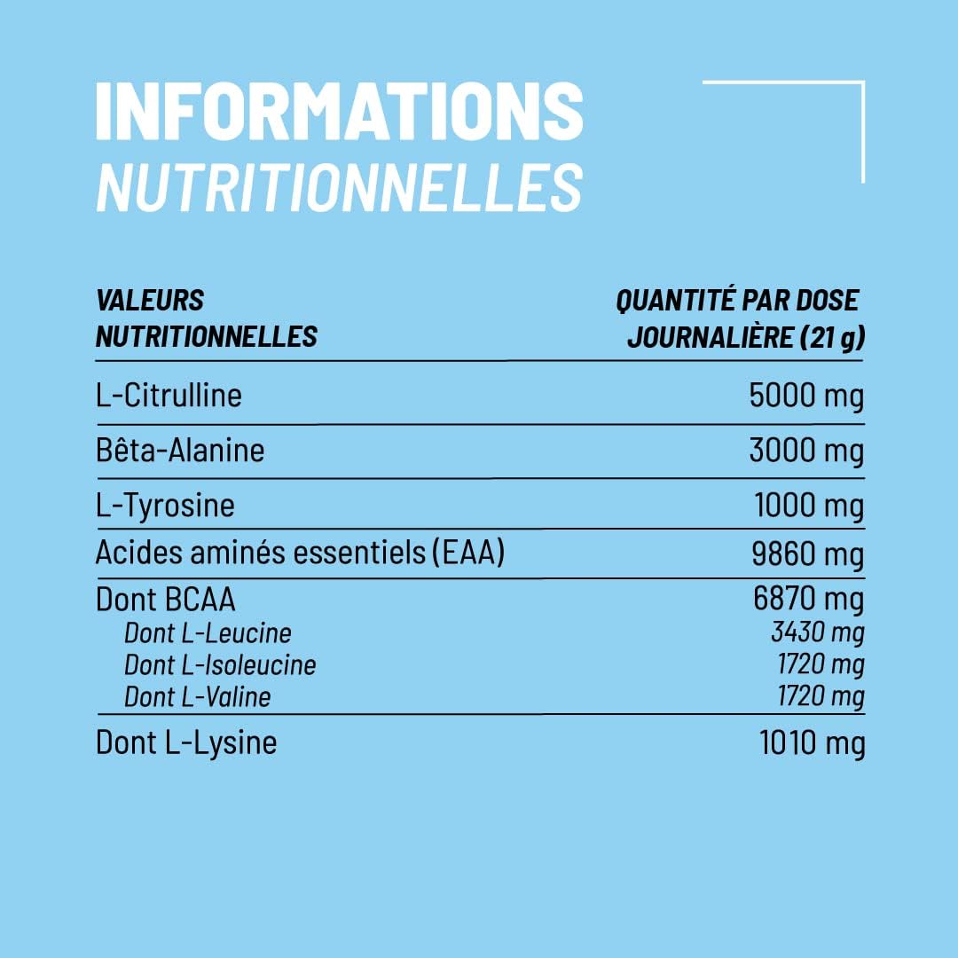 Pre workout made in France: This caffeine-free bodybuilding booster with blueberry taste will offer you the benefits of each component without the need for caffeine. Use a sachet before your session to exceed your usual performance! High quality product thanks to its French manufacture and the labelling of the molecules.