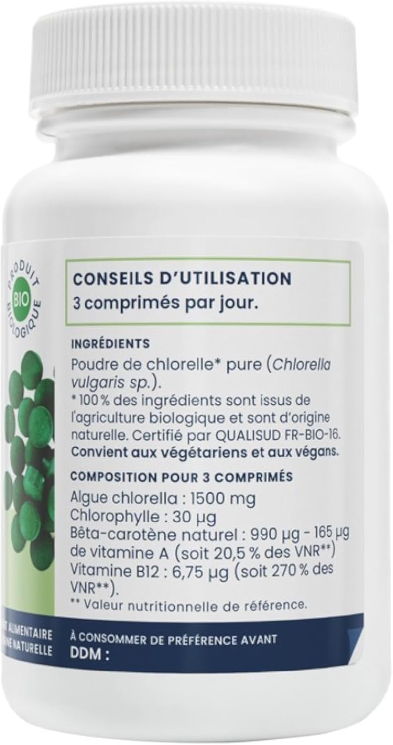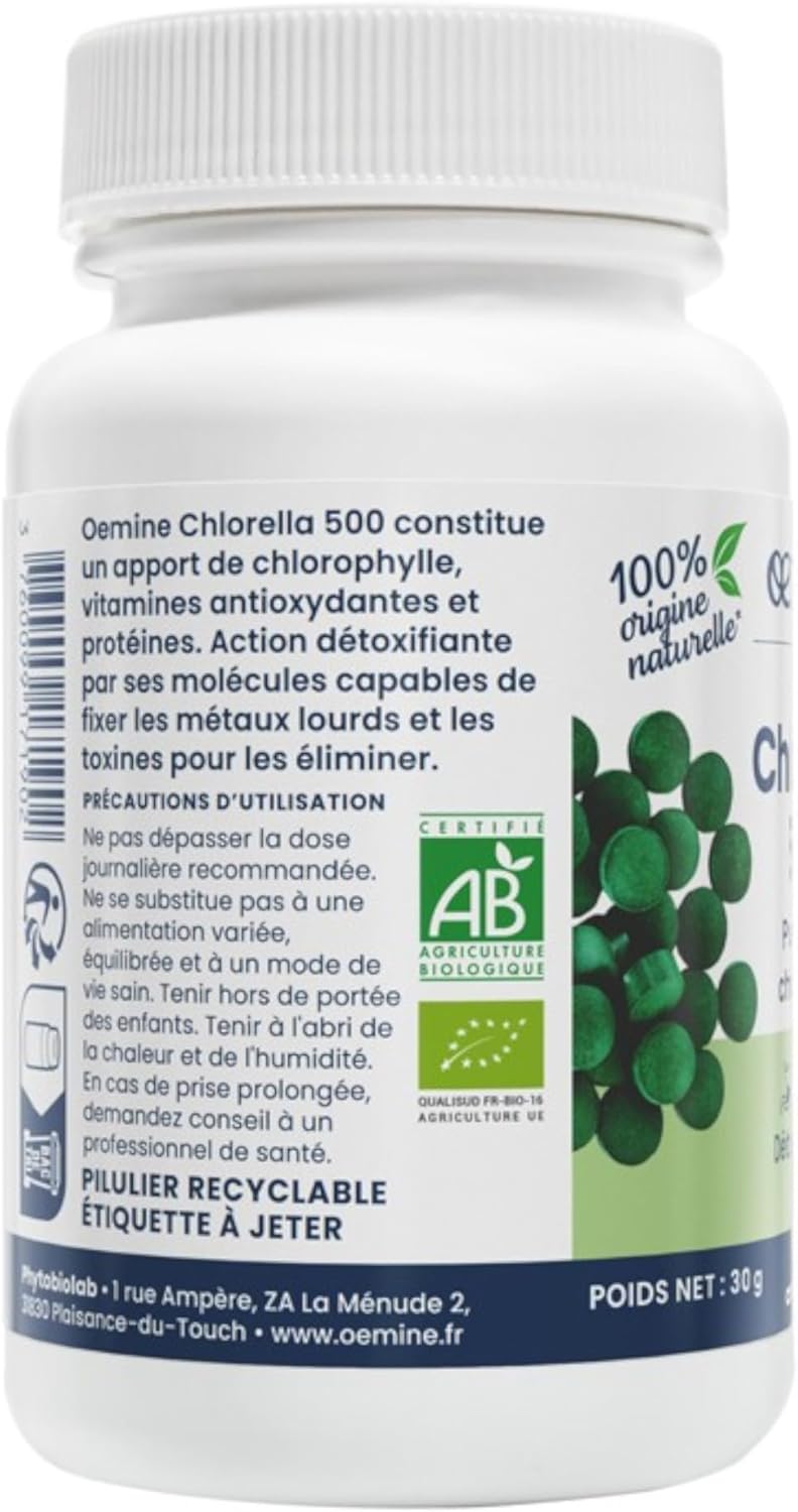 This organic chlorella provides a powerful cocktail of benefits for optimal health. Its detoxifying chlorophyll, regenerating proteins and vitamins B1 contribute to the normal functioning of the nervous system, while vitamin A helps maintain normal skin and vision. Certified pure and non-GMO, it ensures a quality nutritional intake. Chlorella releases natural detoxifying agents, thus preserving cells from oxidative damage. Do not exceed the recommended daily dose. It is not a substitute for a varied, balanced diet and a healthy lifestyle. Keep out of reach of children. Keep away from heat and moisture. In case of prolonged intake, seek advice from a healthcare professional. Ingredients: pure chlorella powder* (Chlorella vulgaris sp.). *Ingredients from an organic farming method.100% of the ingredients are from organic farming. Organic food supplement controlled by QUALISUD FR-BIO-16. Oemine Chlorella 500 is guaranteed to be free from colourants or preservatives without the addition of synthetic products. Average composition for 2 tablets: 1000 mg pure chlorella, Chlorophyll: 20 mg, Protein: 6 g, Vitamin B 1 (thiamine): 0.13 mg (11% of NRV**), Vitamin A in the form of Carotenoids: 589 IU (32% of NRV**). ), Vitamin K: 2.6 micrograms (3% of NRVs**) Average amino acid composition for 2 tablets / Glutamic acid 66 mg, Aspartic acid 48 mg, Lysine 48 mg, Leucine 45 mg, Alanine 44 mg, Arginine 35 mg, Glycine 31 mg, Valine 31 mg, Valine 31 mg mg, Thre onine 24 mg, Serine 22 mg, Isoleucine 20 mg **NRV: nutritional values Reference