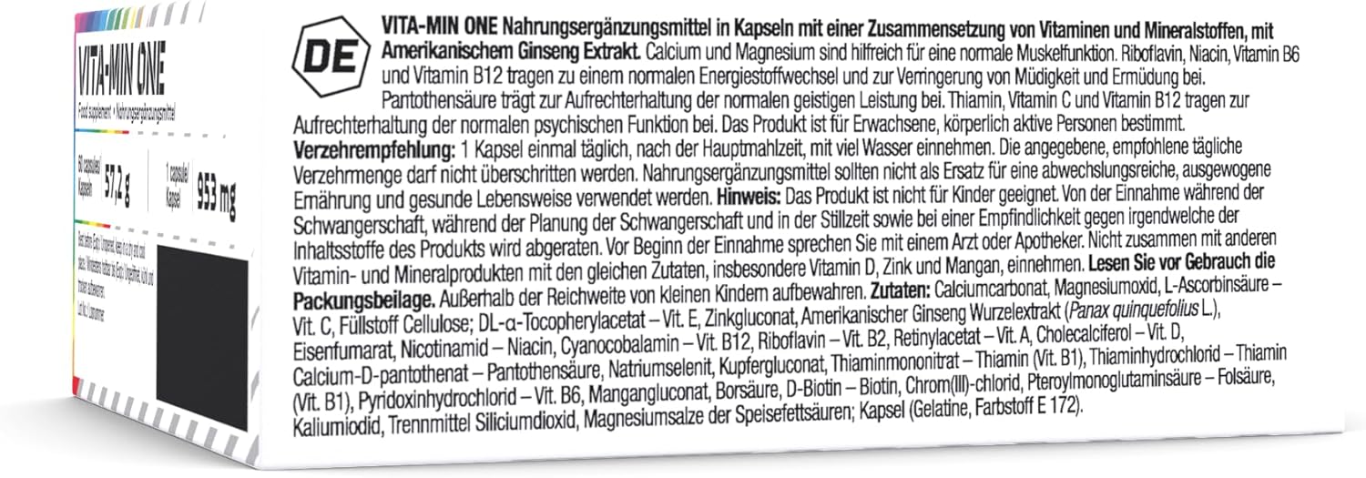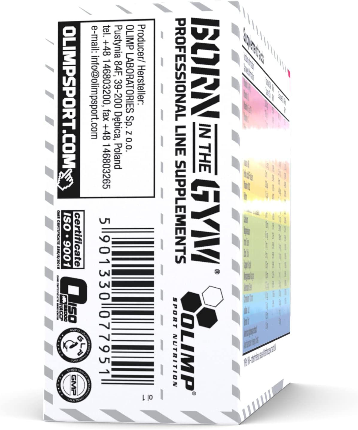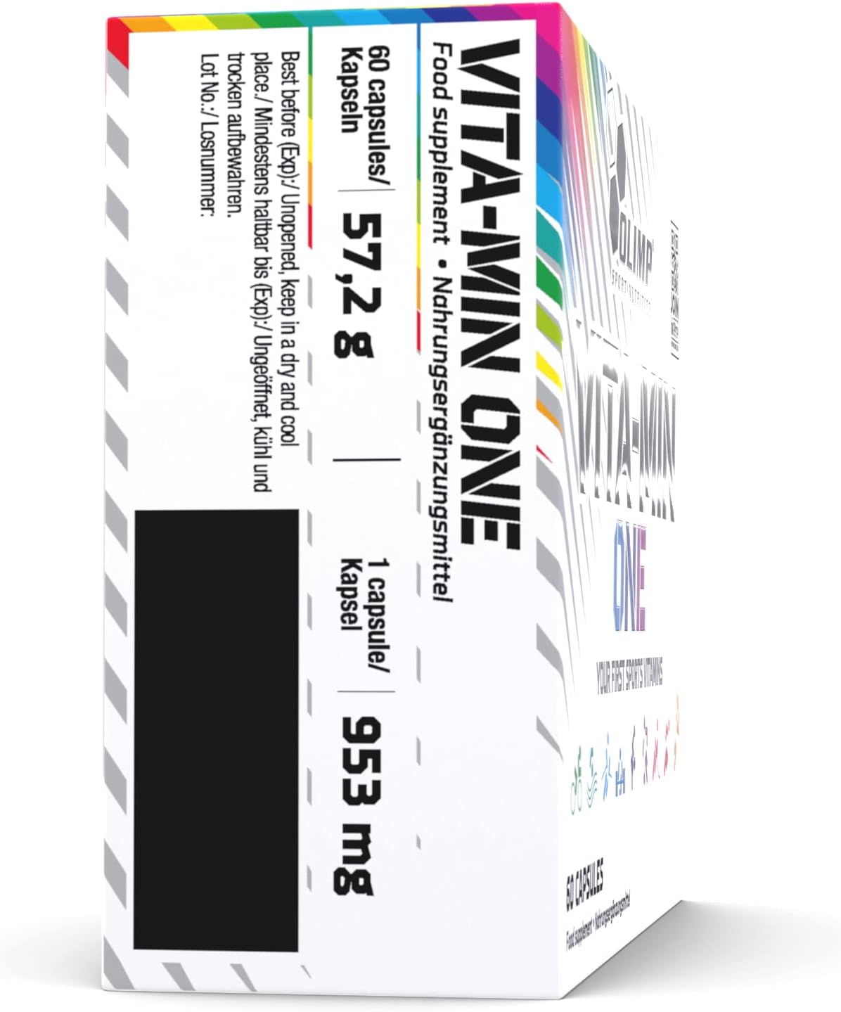 Vita-min One they are vitamins and minerals for all those who care about their health and appreciate the character of the dietary supplements used. Developed in the laboratories of the pharmaceutical company OLIMP Laboratories, this product is distinguished by the quality of its ingredients, their scientifically proven efficacy and the essential physico-chemical analyses of the raw materials used, including purity tests (e.g. To confirm the absence of heavy metals), which guarantees the safety of the product bearing the logo of Olimp Sport Nutrition. Opting for VITA-MIN One you are sure to receive a proven dietary supplement, manufactured according to international standards, which will help to supplement the body’s daily demand for essential vitamins and minerals, with a positive effect on: the proper functioning of the nervous system (vit. C, B6, B12, thiamine, riboflavin, biotin, niacin, magnesium, copper); the proper functioning of the immune system (vitamins A, B6, B12, C, D, folic acid, iron, zinc, copper); reduction of the feeling of fatigue and exhaustion (vitamins C, B6, B12, folic acid, pantothenic acid, magnesium, iron, riboflavin, root ine); maintaining a good energy metabolism (vitamins C, B6, B12, thiamine, riboflavin, biotin, niacin, iron, magnesium, iodine, manganese, calcium); persistence of good vision (vit. A, riboflavin, zinc); the maintenance of healthy skin (niacin, biotin, zinc) of hair and nails (biotin, zinc); normal production of red blood cells, hemoglobin and abnormalities free transport of oxygen in the body (iron); proper assimilation of calcium (vit. D); maintaining bone health (vit. D, calcium); proper functioning of muscles (vit. D, magnesium); the persistence of a good level of testosterone in the blood (zinc).