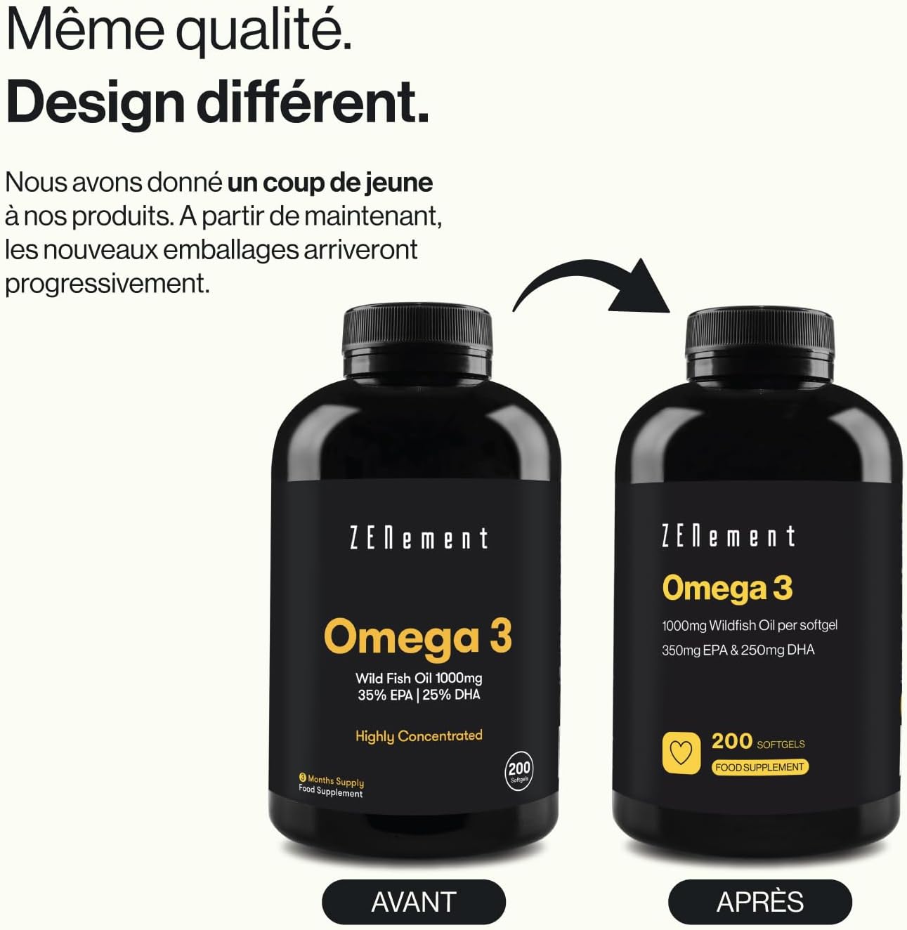 HIGH OMEGA‑3 CONTENT WITH EPA/DHA RATIO 35/25: Our formula provides 2000 mg of Wild Fish Oil per daily dose, including 700 mg of EPA and 500 mg of DHA. This EPA/DHA 35/25 ratio provides a balanced supply of essential fatty acids, ideal for integrating a powerful and concentrated Omega‑3 supplement into the daily routine.