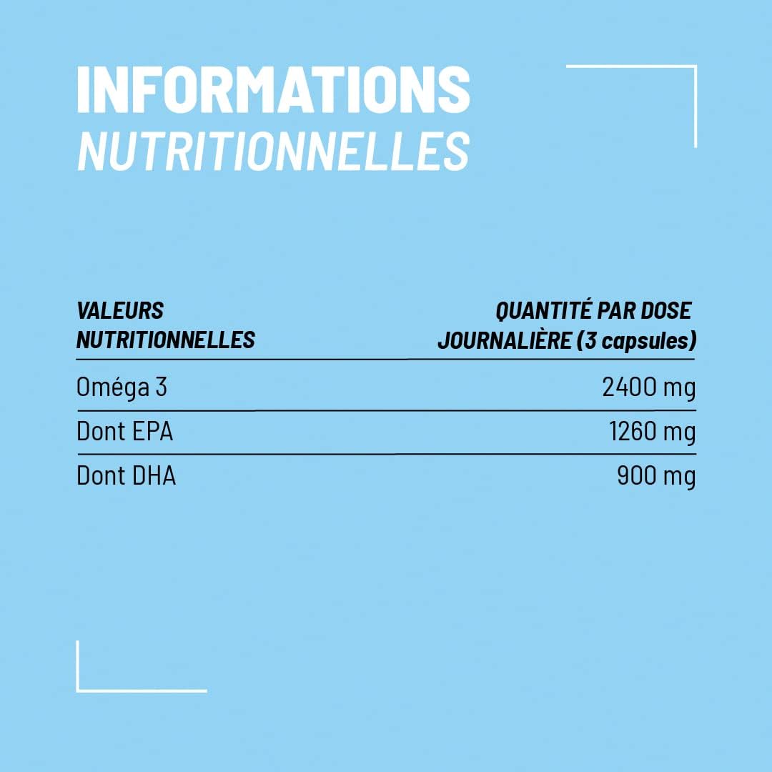 DOSAGE: The dosage of the dietary supplement omega 3 Nutripure is 3 capsules per day with a glass of water preferably during meals in order to distribute the doses of Omega 3. 3 capsules provide 2400mg of omega 3, including 1260mg of EPA and 900mg of DHA. We advise you to store your capsules in the refrigerator. Pack of 90 capsules for 1 month of treatment.