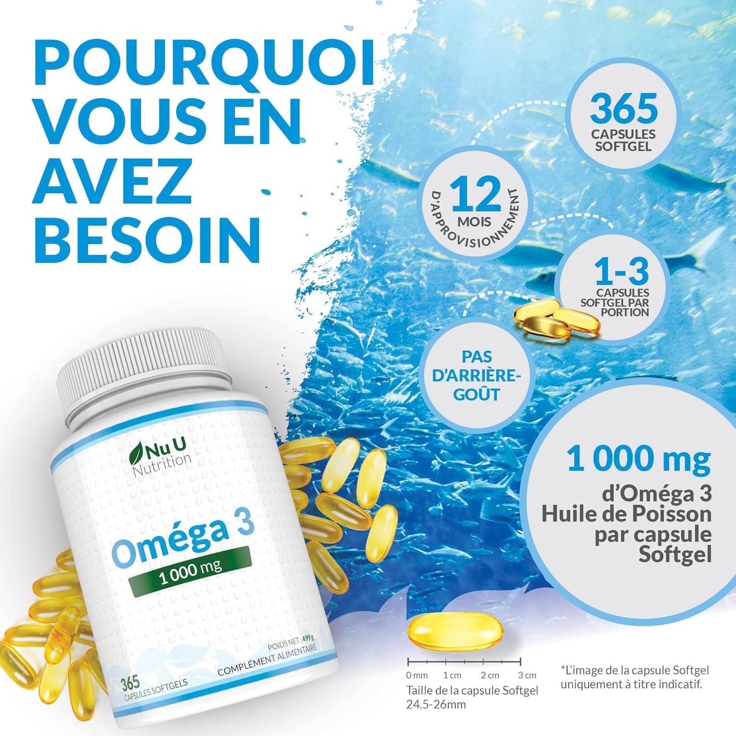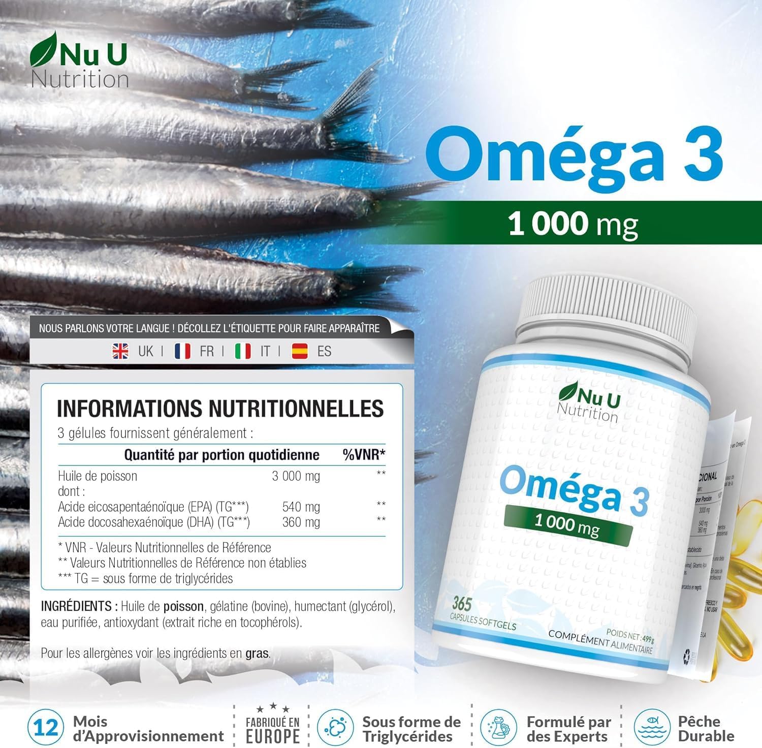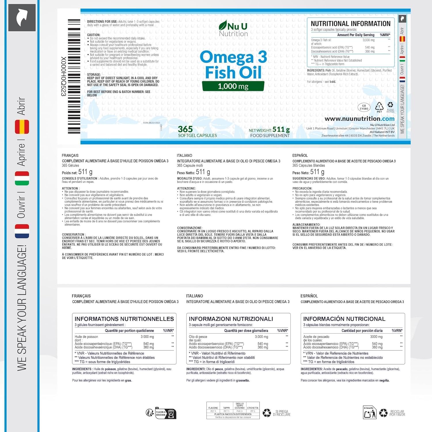 Omega 3 Fish Oil 1000 mg – Fish Oil – 365 Capsules – 1 Year Cure – Rich in EPA 540mg and DHA 360mg – Dietary Supplements Nu U Nutrition