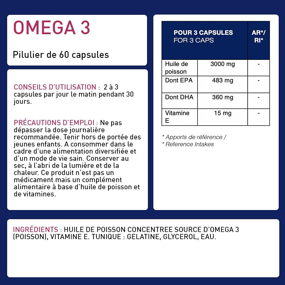 SUPPORTS FOR 3 OMEGA 3 CAPSULES: Fish oil 3000 mg; Of which EPA 483 mg; Of which DHA 360 mg; Vitamin E 15 mg. Capsule of plant origin. An essential dietary supplement for long-term good health!