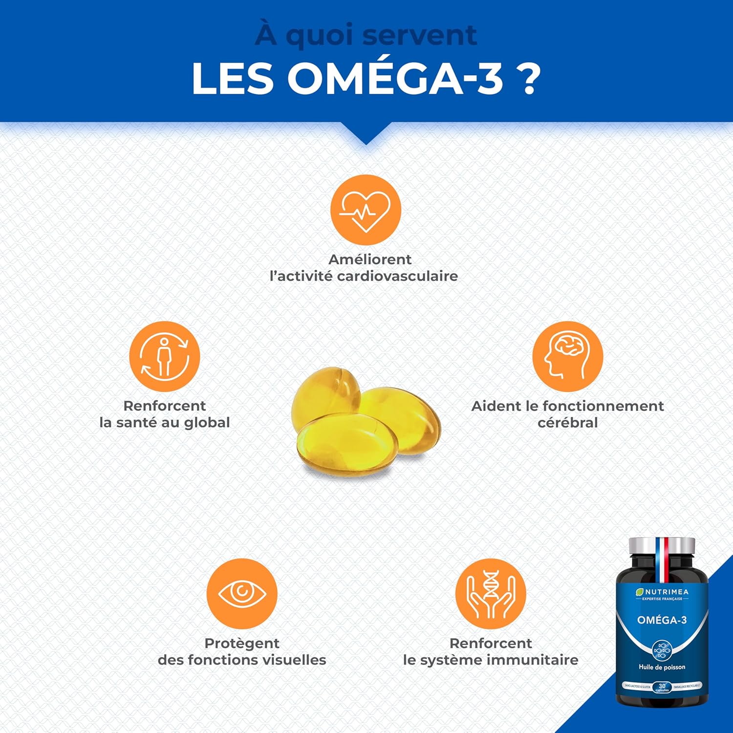 ●● THE BENEFITS OF OMEGA 3 ●● Nutrimea has developed a second formula rich in omega 3 from fish oil. Omega 3 has so many health benefits: heart, brain health, immunity, but also overall health. Omega 3 are essential nutrients to be very healthy.