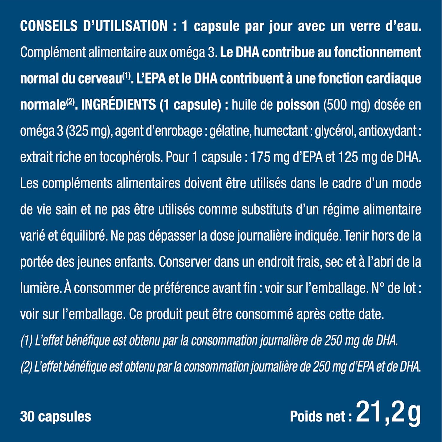 Is your vision weakening? Do you have difficulty concentrating or remembering certain memories? Are you looking to take care of your health in general? Omega 3 such as EPA (eicosapentaenoic acid) and DHA (docosahexaenoic acid) are present in oily fish. What is their interest? Essential for the heart, they contribute to normal heart function By contributing to the normal functioning of the brain, DHA is a true ally of brain activity, memory, concentration and emotions. DHA also contributes to the maintenance of vision These effects are achieved by daily consumption of 250 mg of DHA. Our oil comes from species of sardines and anchovies. It contains long-chain omega 3 polyunsaturated fatty acids and is also dosed in EPA and DHA. Fish oils are naturally rich in omega 3, which is why we chose them in this formula. In what cases do we recommend our Omega 3? If you do sports If you want to stay healthy If your eyes or vision are weakening If you want to take care of your general health