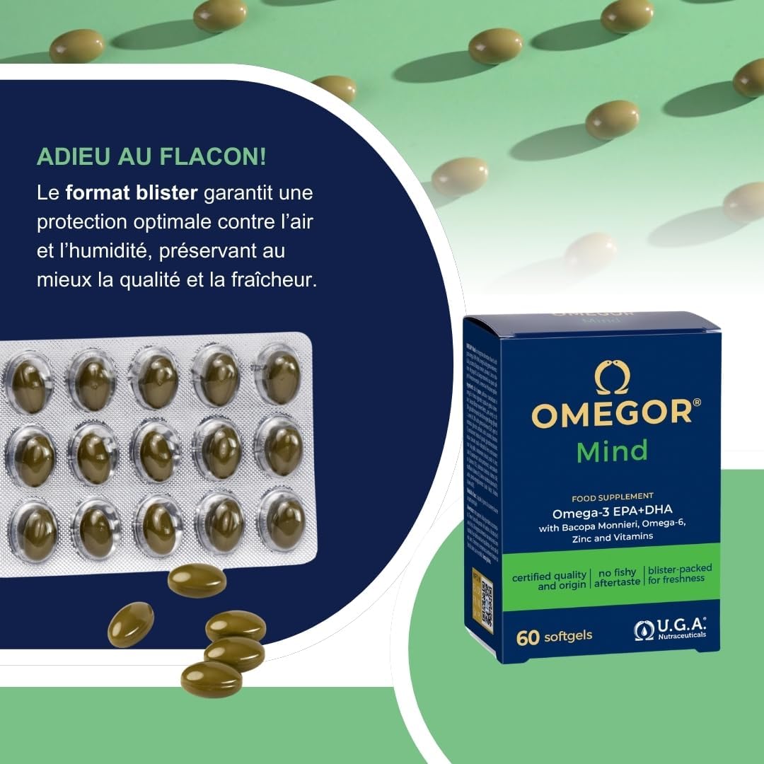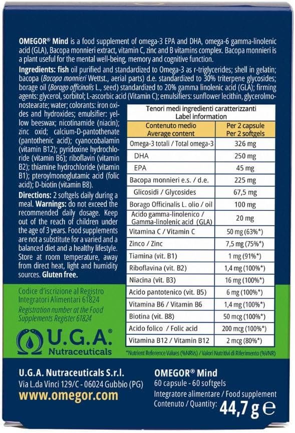 Natural Cognitive Enhancement: Experience the power of supplementation with OMEGOR Mind, formulated with Omega 3 DHA and Bacopa Monnieri extract to support memory and cognitive function. Ideal for students, professionals and seniors who want to keep the mind agile.