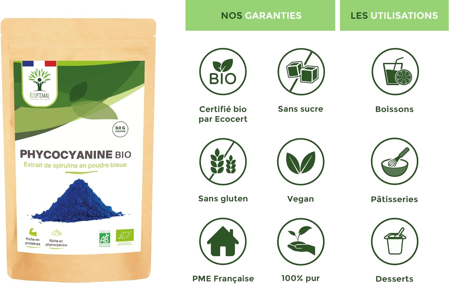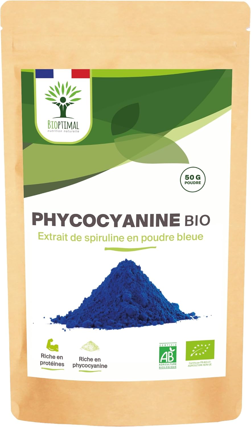 Organic Blue Spirulina – Bioptimal – Powder – 30% Phycocyanin Blue 80% Proteins – Intense Blue Food Colouring – Cooking Recipe – Controlled and Packaged in France – Certified by Ecocert – 50 g