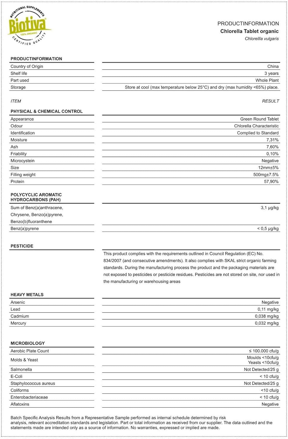 ORGANIC CHLORELLA TABLETS contain 100% pure dried chlorella algae from organic farming, name lat. Chlorella vulgaris. We do not use separating agent, filler or flow agent. Nothing but pure nature.