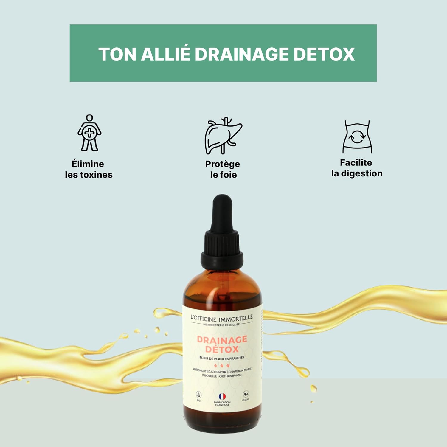 Revitalisez votre organisme avec notre Élixir Drainage Détox, une extraction hydroalcoolique de plantes fraîches, spécialement conçue pour détoxifier et drainer.