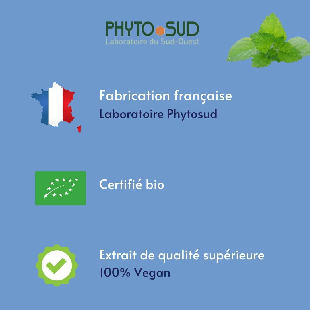 ORGANIC MELISSE: Phytosud offers a food supplement composed of organic lemon balm extract, made from organic lemon balm leaves. The addition of organic lemon balm powder makes it possible to offer a very pure nutritional supplement and to provide the totum of the plant. Avicenna, the great Arab doctor of the 11th century, said of lemon balm that she had the power to “rejoice and comfort the heart.”