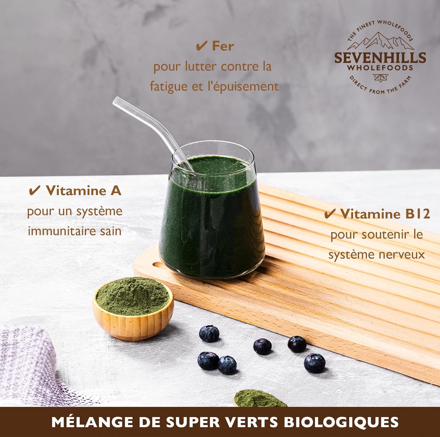 Organic Super Greens Blend with Spirulina, Chlorella, Wheat Grass, Barley Grass | Supports Skin, Immunity | 200g, 40 Servings | Green Superfood Powder Sevenhills Wholefoods