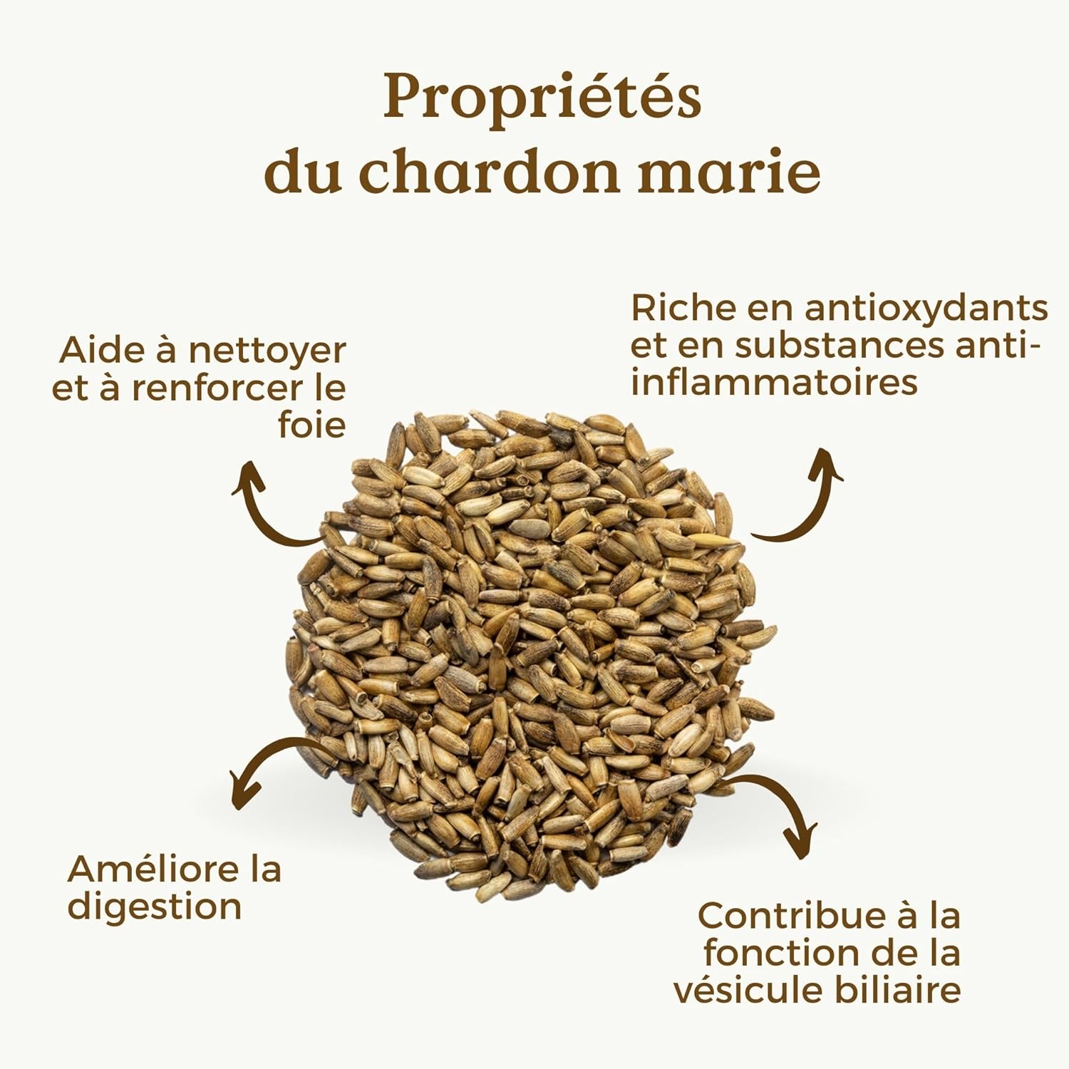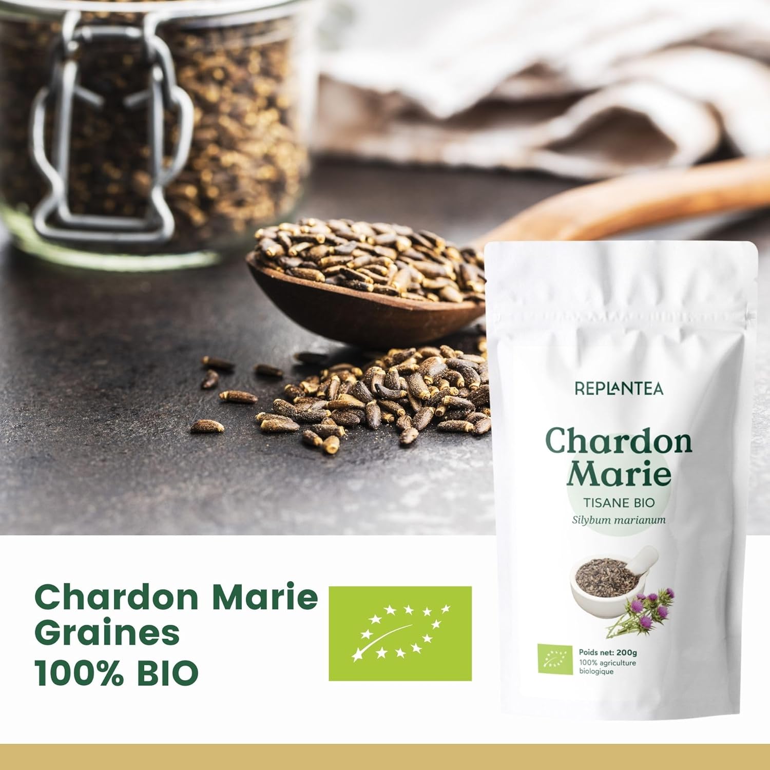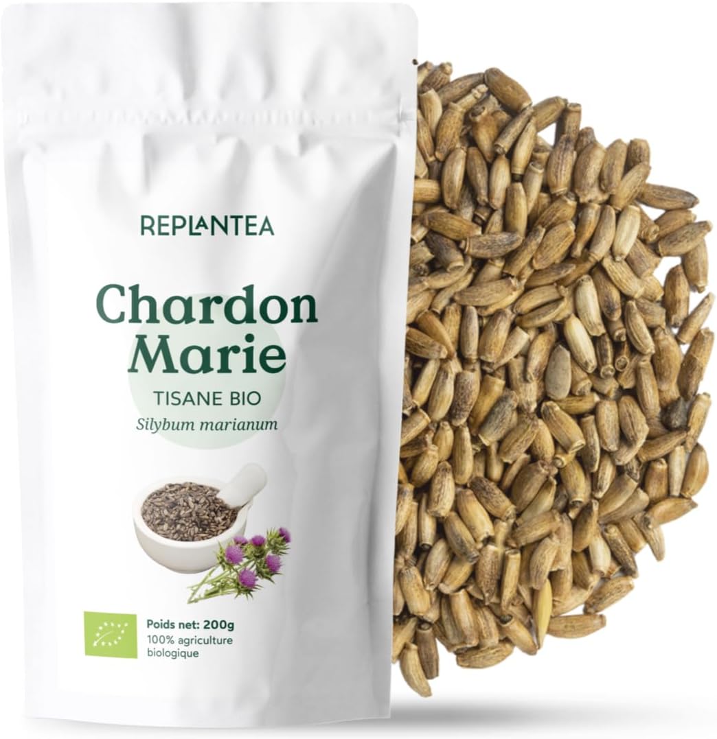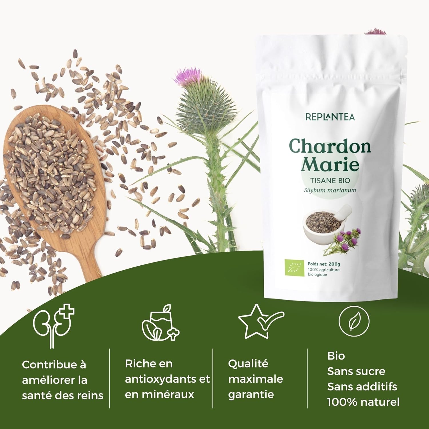 Discover the ORGANIC TEA MARIE CHARDON 200g (100 Cups). This herbal tea made from organic milk thistle seeds provides a gentle and natural detoxification of the liver, supporting digestive and liver health. Thanks to its purifying properties, it helps to remove toxins from the body, providing a feeling of calm and well-being. Perfect for a relaxing break, it allows you to enjoy up to 100 cups of soothing and purification.
