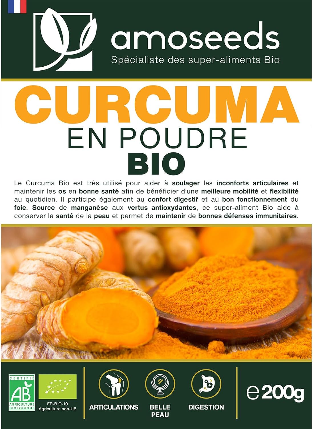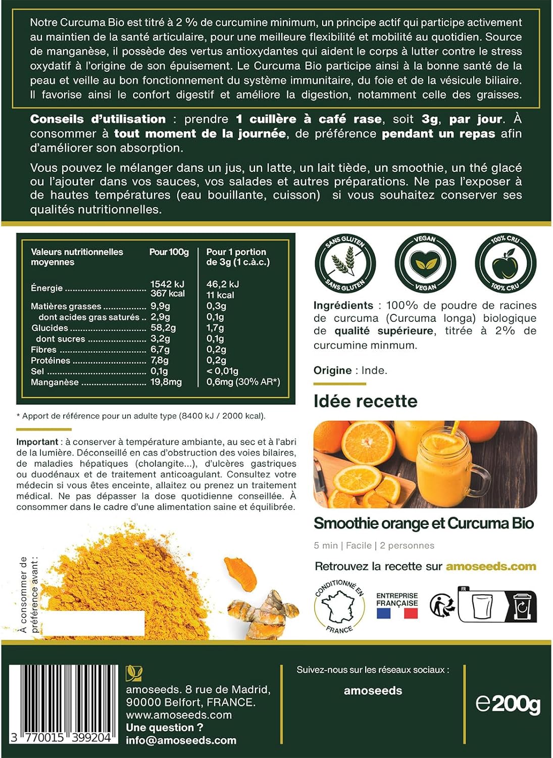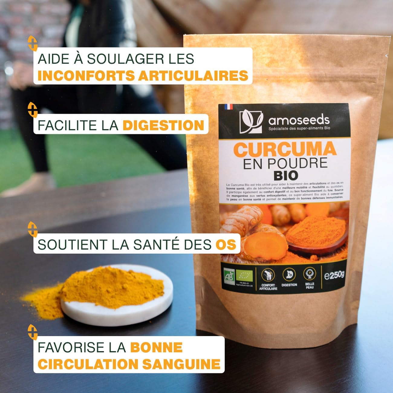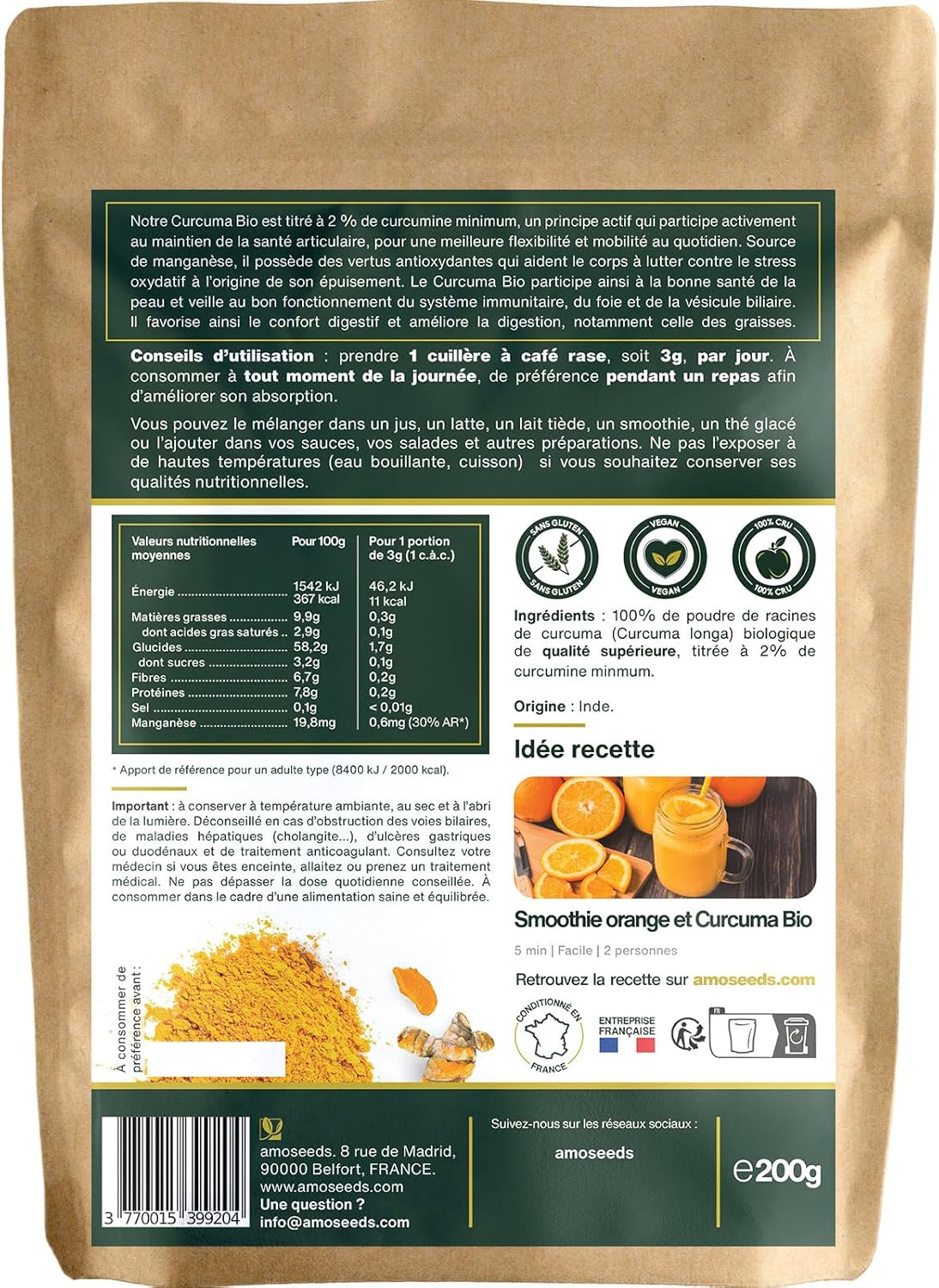 ✅ ORGANIC CERTIFIED: Resealable Kraft bag of 250g of amoseeds top quality organic turmeric root powder. 100% natural product, pure, vegan, no additives, no preservatives, no GMOs, no pesticides, no artificial colours, no lactose, no soy and gluten. Each batch is tested by third parties to ensure quality and purity.