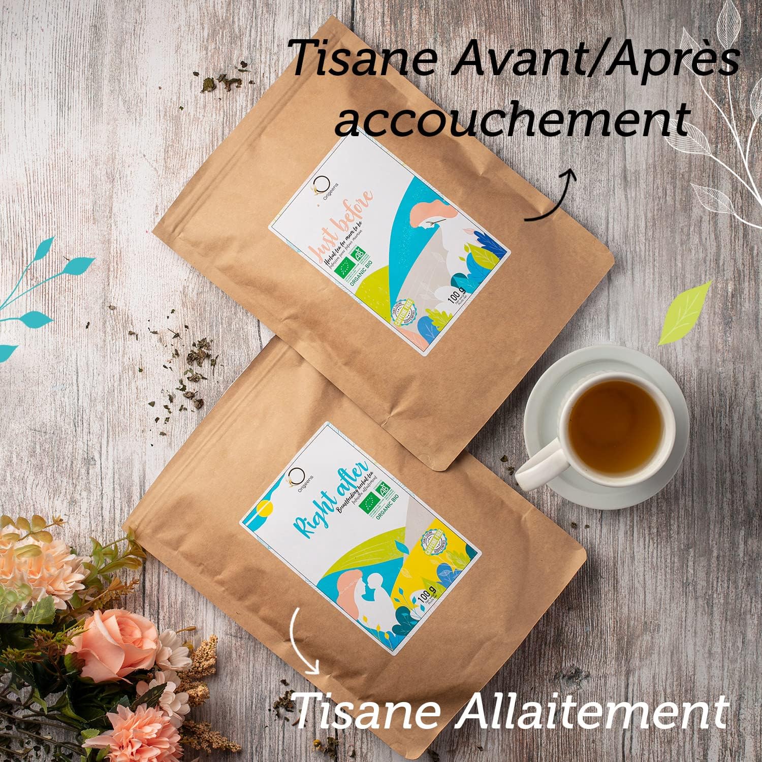 La tisane de grossesse / post partum Just Before, aux notes douces de camomille, d’orange et de citronnelleLa tisane d’allaitement / digestive Right After, au goût frais de citron, gingembre et curcuma, et aux notes anisées