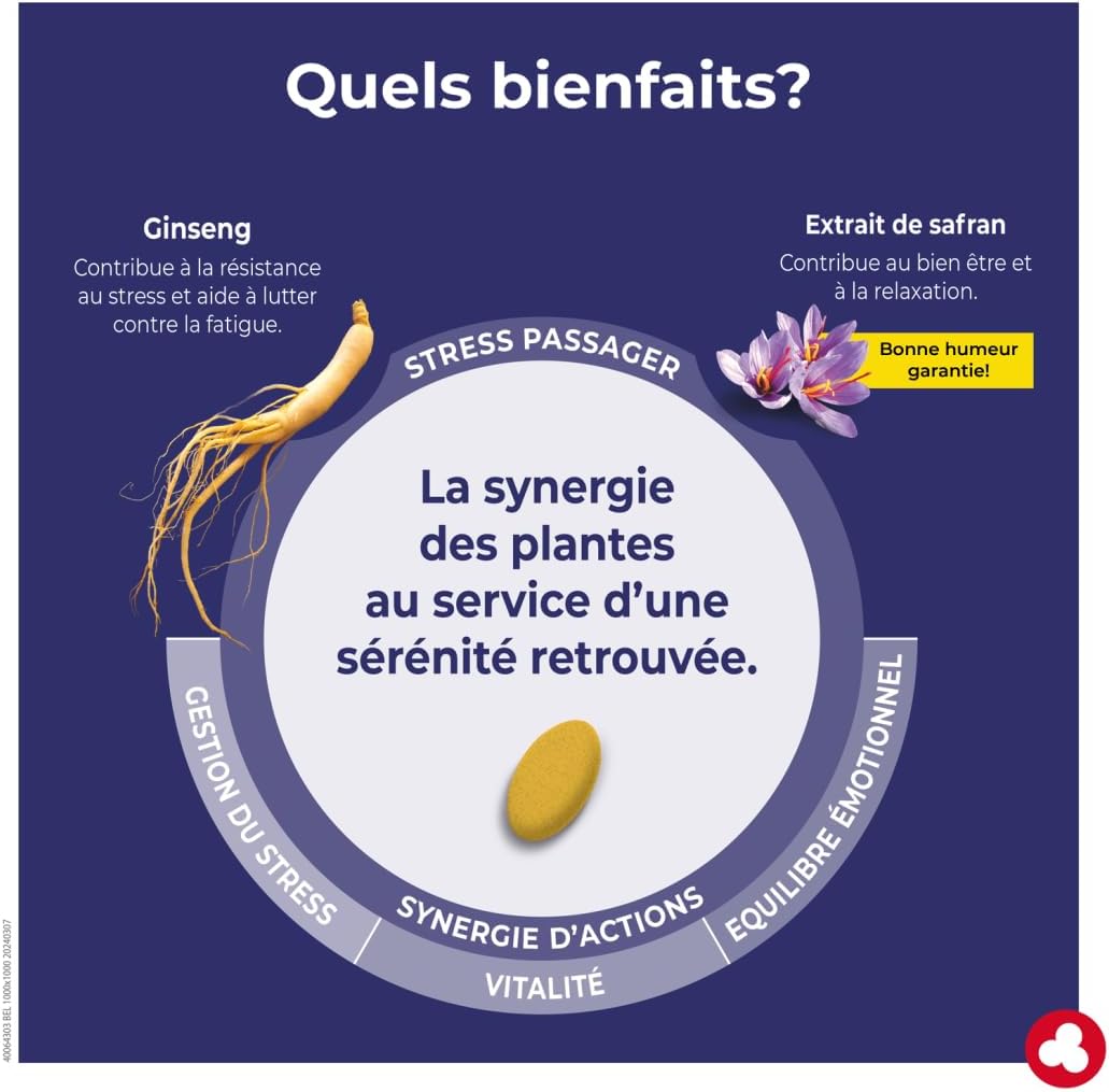 Relax & Go helps with temporary stress thanks to the action of 2 highly concentrated plants. Ginseng powder highly concentrated in ginsenosides is adaptogen. Ginseng contributes to stress resistance and helps fight fatigue in order to avoid exhaustion.Saffron extract participates in the regulation of dopamine, the hormone of well-being. It helps maintain a good mood and contributes to mental well-being. Stress allows us to respond to complex situations and “stimulates” us, thanks to adrenaline. But a state of stress that is permanent, or that sets in the long term, will release cortisol – the brain’s wake-up hormone – and mobilize significant energy reserves. Such a situation will therefore lead to poor quality sleep and, consequently, a state of fatigue, or even exhaustion that affects not only our body but also our morale.