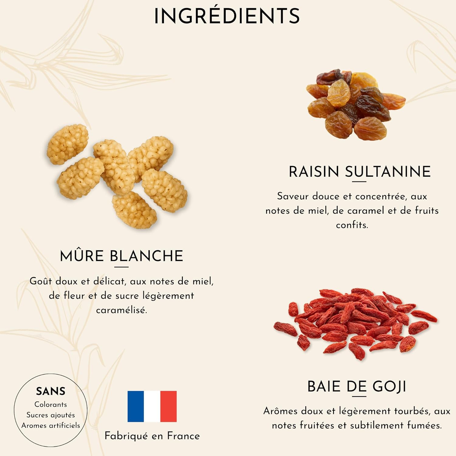 Ananas, Papaye, Gingembre Datte, Figue, Raisin, Fleur de jasmin, Cannelle Fleur d’hibiscus, Canneberge, Mûre blanche Abricot, Amande, Pistache Baie de goji, Raisin, Mûre blanche Banane, Mangue, Noix de Coco