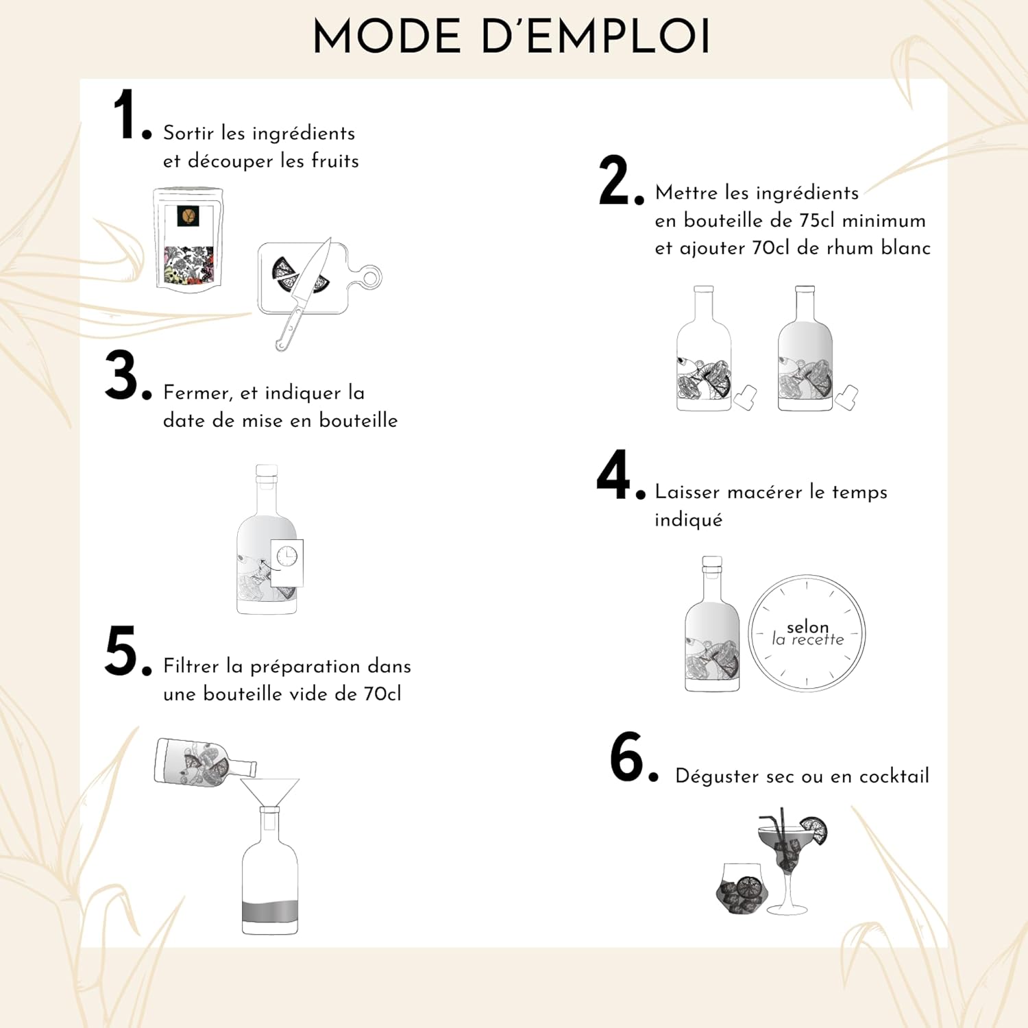 SIMPLE TO MAKE: Ingredients to macerate for 2 months at room temperature in 70cl of white rum at 40°. Then strain the preparation using a coffee filter. No added sugar is required.