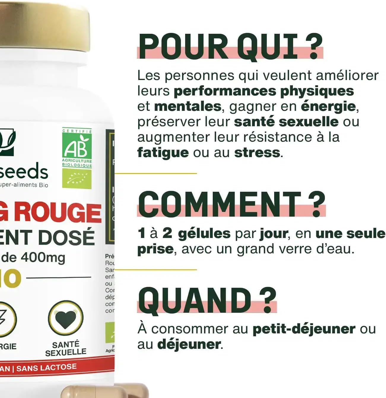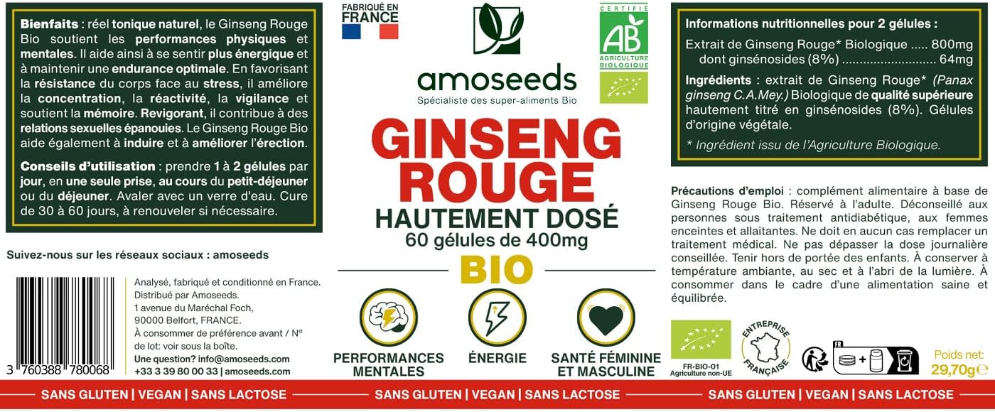 ORGANIC CERTIFIED: Recyclable resealable box of 60 capsules of 400 mg of concentrated organic red ginseng extract of superior quality. 100% pure, vegan, no additives, no preservatives, no GMOs, no pesticides, no artificial colours, gluten free and lactose free. Each batch is tested by third parties to ensure quality and purity. Product analyzed and packaged in France.