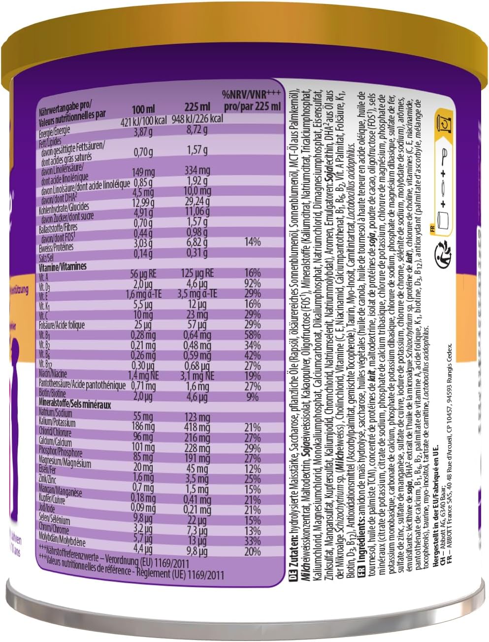 PediaSure Chocolate – PediaSure is a powder containing essential nutrients to support the development of children’s immune system. It is also suitable for children who are particularly difficult and for whom it is difficult to guarantee sufficient nutrient intake. The triple action complex of PediaSure, with its vitamin D and iron composition, promotes cognitive development, immune defenses and growth in children. Your children can start the day with protein pancakes, enrich their curd cheese or yogurt or enjoy the powder as a classic shake. Product details: Food supplement Powder for the preparation of shakes. Use: To prepare a portion of 225 ml, pour about 190 ml of water into a glass. Gradually add 5 sharp measuring spoons (the measuring spoon is included in the box) – stir or shake thoroughly to dissolve the chocolate PediaSure powder