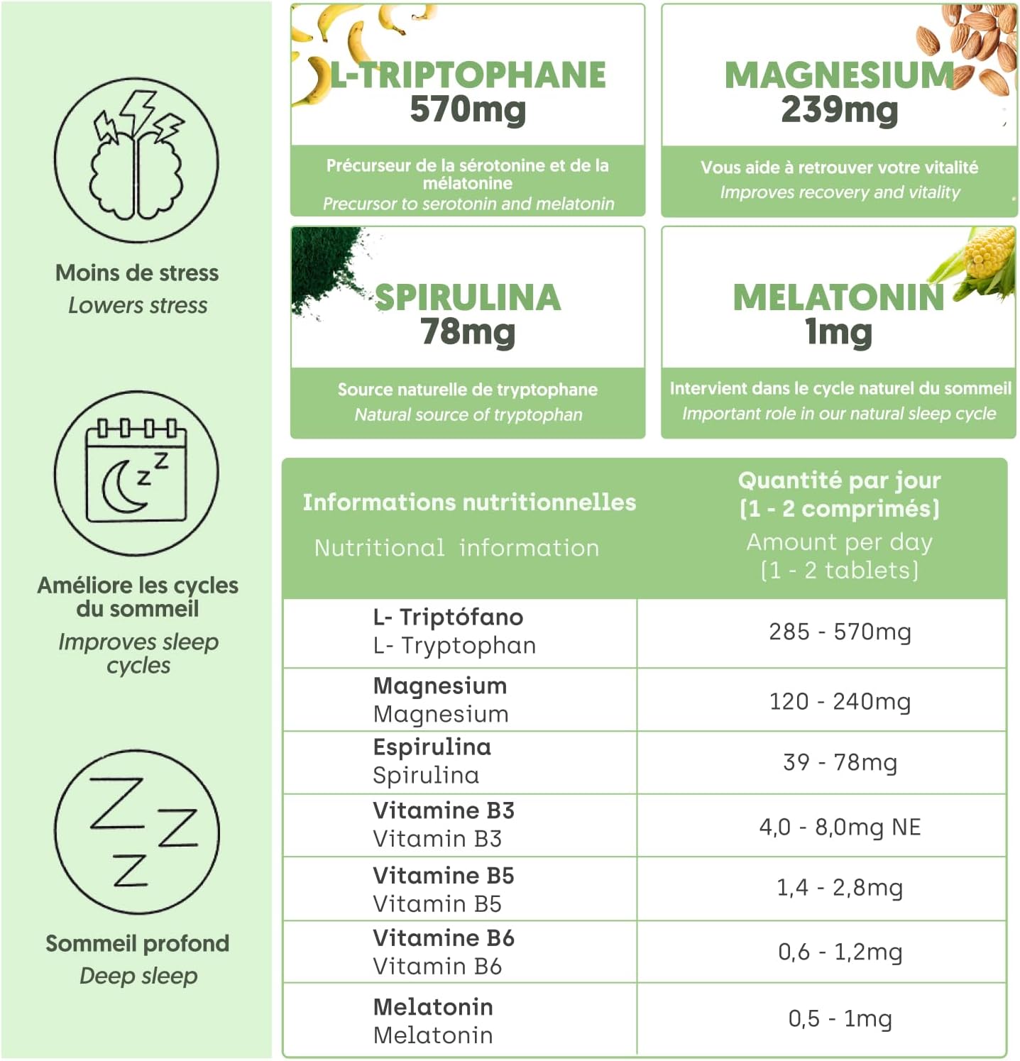 REPAIR SLEEP: Get a deep and restful sleep thanks to a 100% natural remedy that will give you a boost of energy, increased concentration and a better psychic state throughout the day thanks to melatonin and spirulina