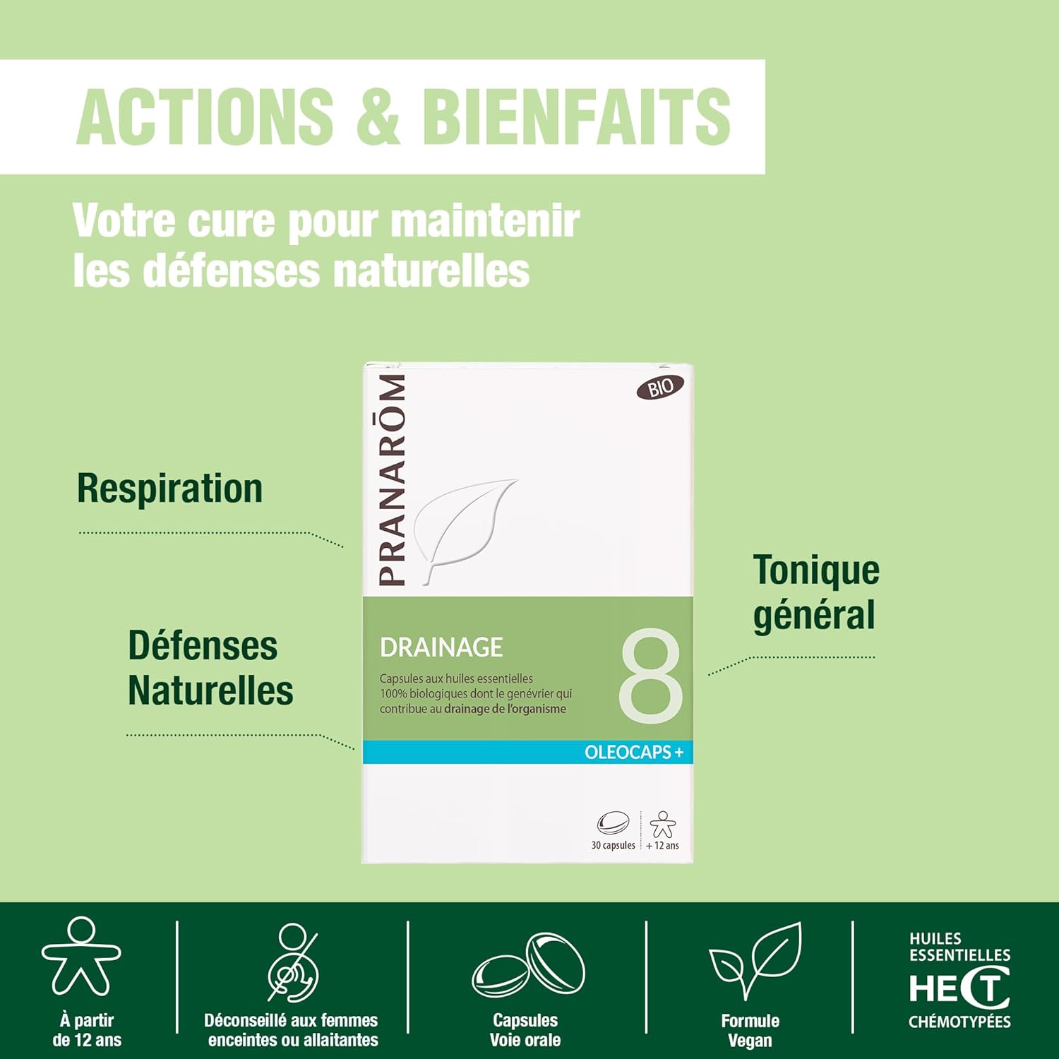 PRANARÔM – Oleocaps 8 – Drainage – Targeted Essential Oils – Peppermint, Lemon, Ginger, Cardamom, Mandarin & Juniper – 100% Natural & Organic – HECT – 30 Pre-dosed Capsules