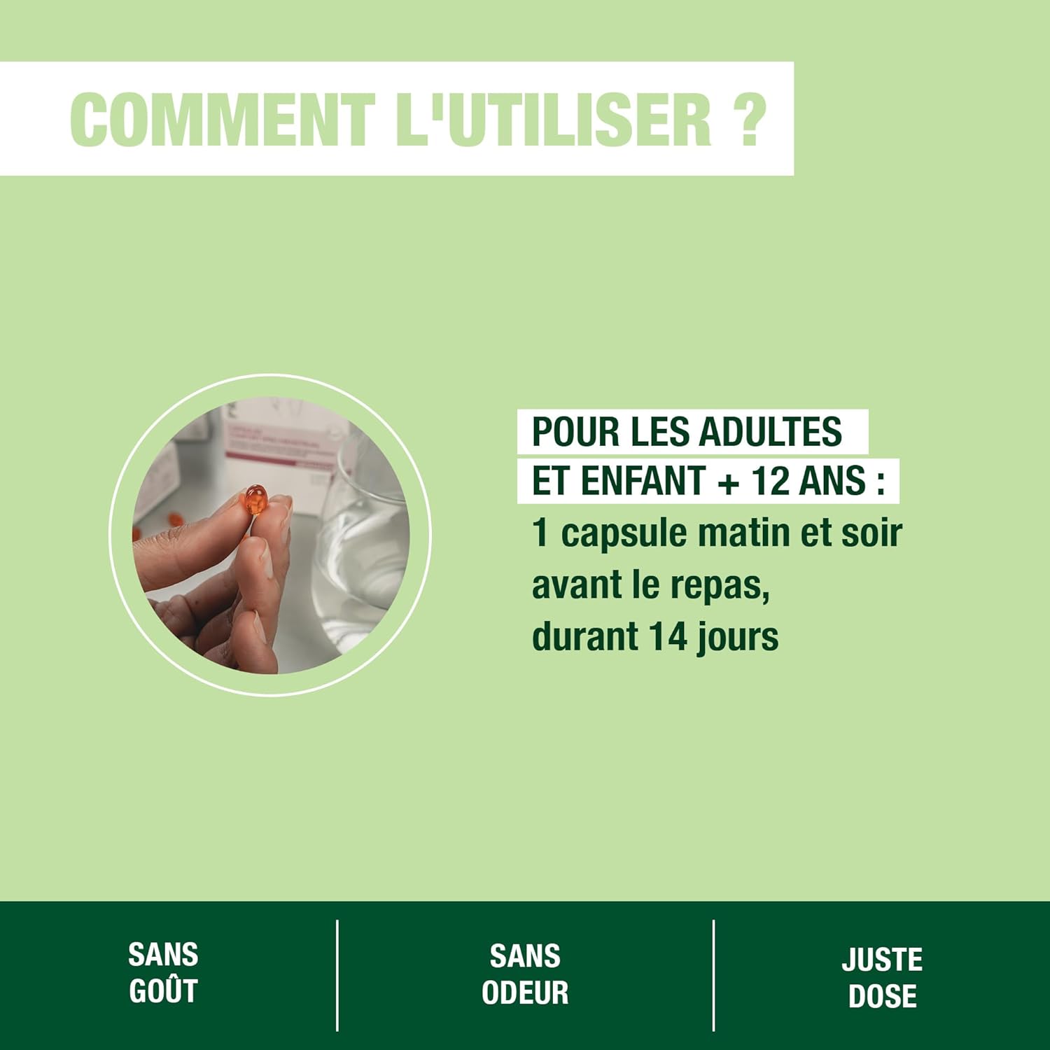 Instructions for use: From 12 years, one capsule morning and evening before the meal for 14 days. This cure can be repeated up to 4 times a year. Swallow with a little water. Do not use during pregnancy and during breastfeeding.