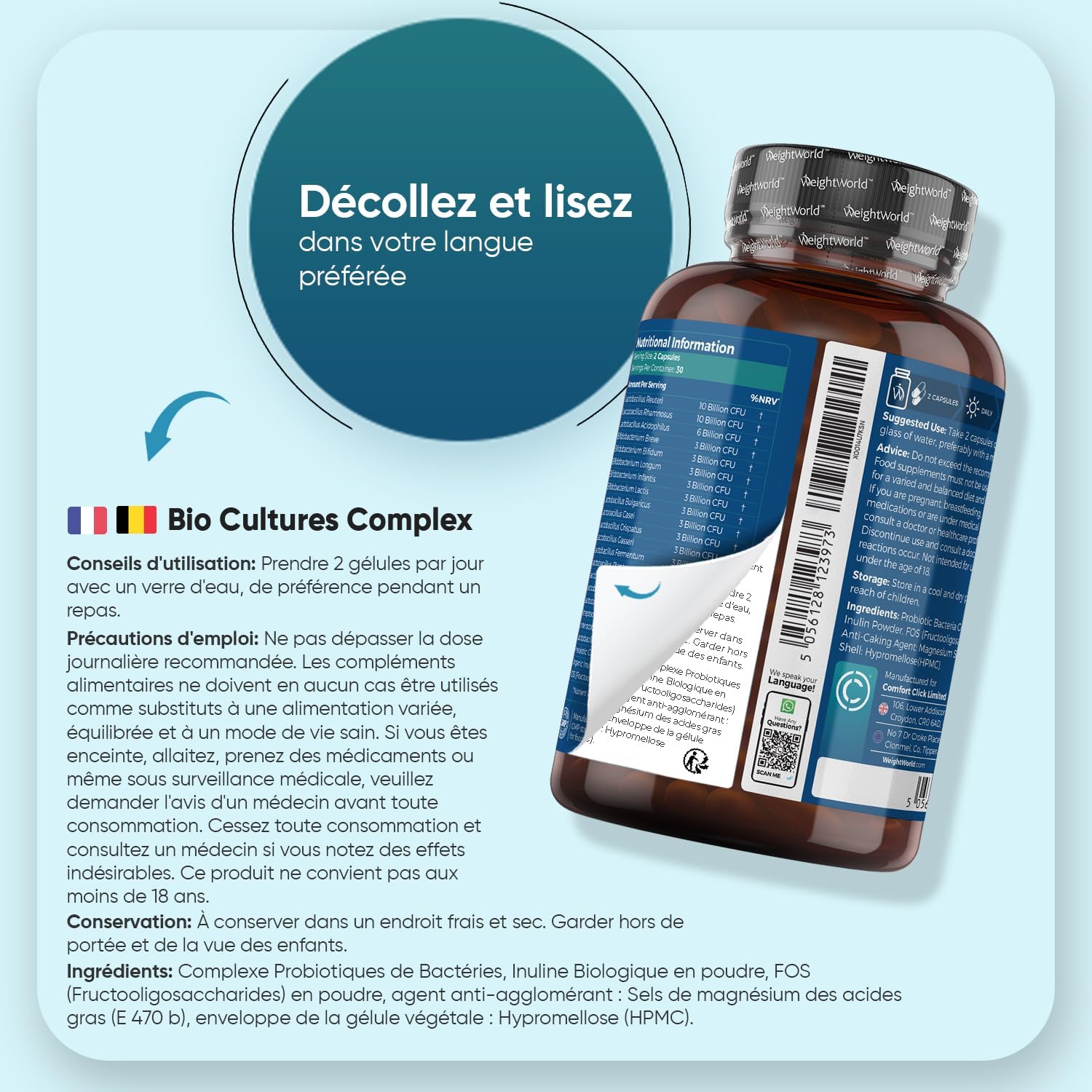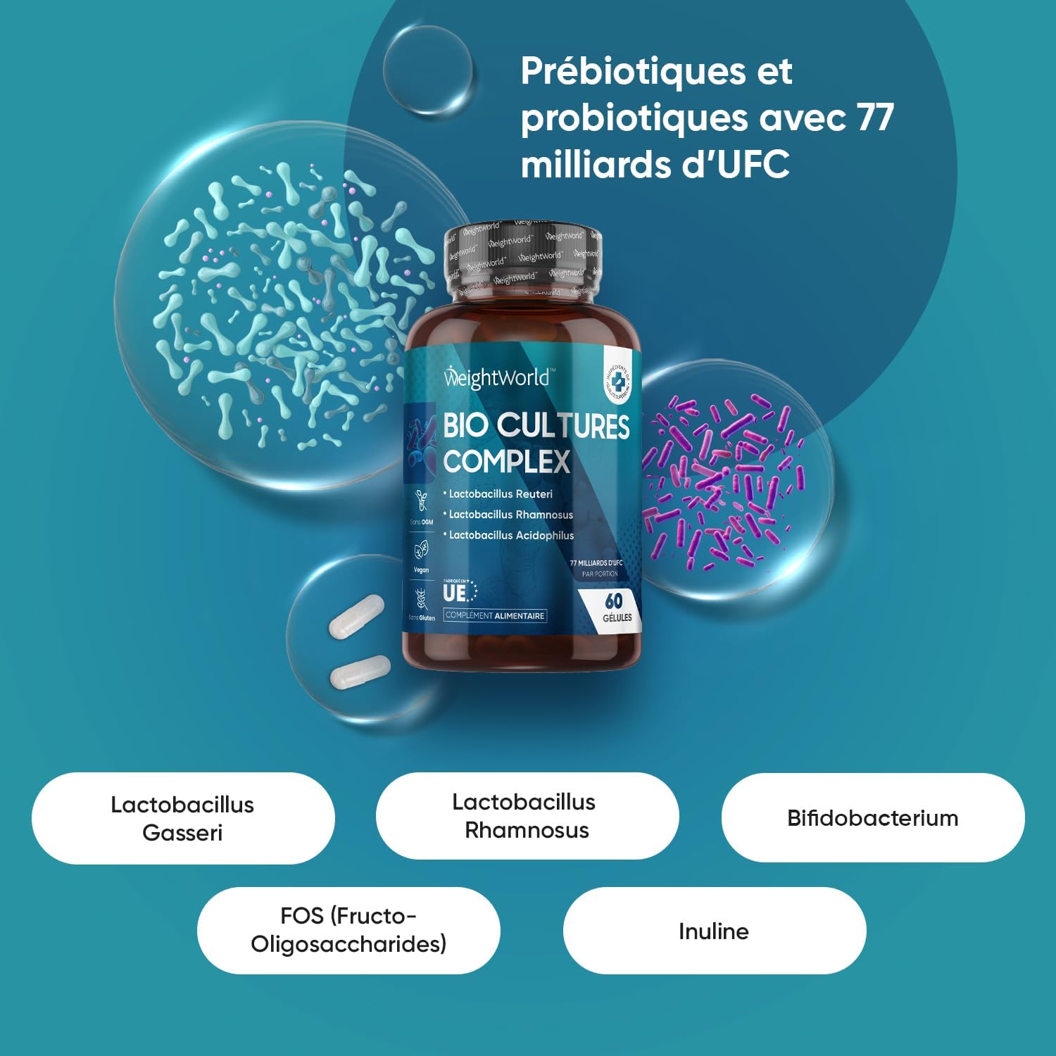 20 Carefully Selected Strains – WeightWorld Prebiotic and Probiotic combines 20 strains of good bacteria and a total of 77 billion CFUs per serving. The number of strains and the concentration of CFUs play a critical role in the composition of the probiotic formula, supplemented by lactic ferments and prebiotic fiber, such as FOS and inulin.