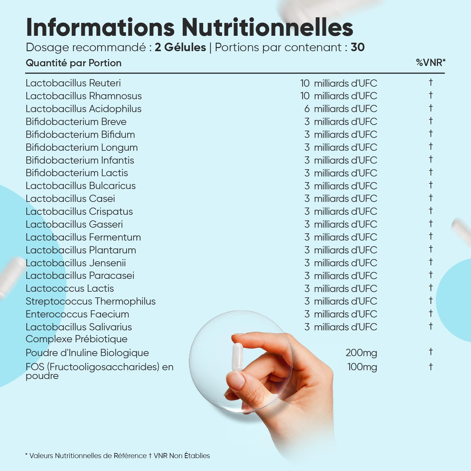 Lactic Ferments and Probiotics – These capsules are composed of strains of Bifidobacterium (probiotics), FOS (fructo-oligosaccharides) and organic inulin, two types of prebiotic fiber, which add to the action of probiotics for good bacteria. Thanks to lactic enzymes, probiotics contribute to the balance of the intestinal flora.