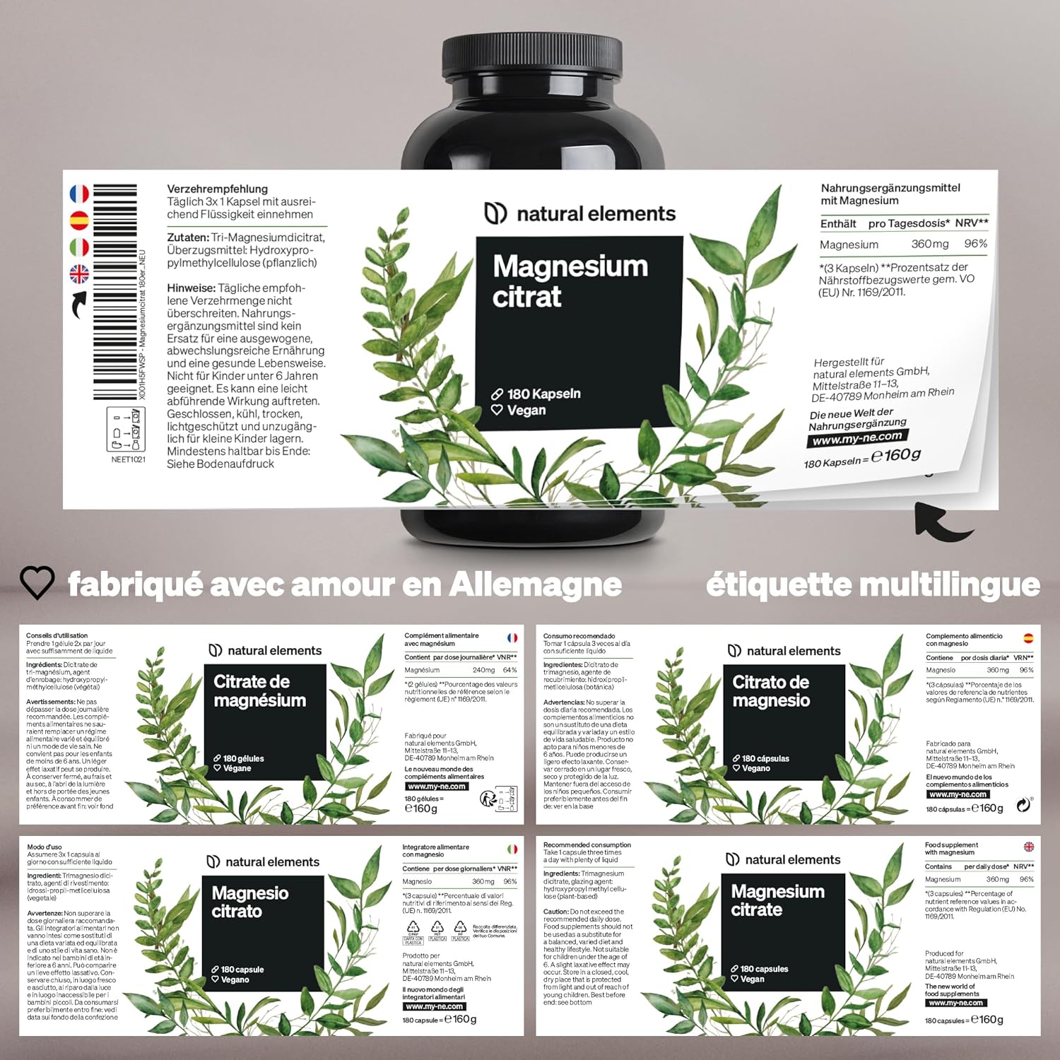 Premium Magnesium Citrate, 2320mg including 360mg of Elemental Magnesium per Daily Dose, 180 Capsules for 3 Months, For Muscles, Bones & Immune System*, Lab Tested