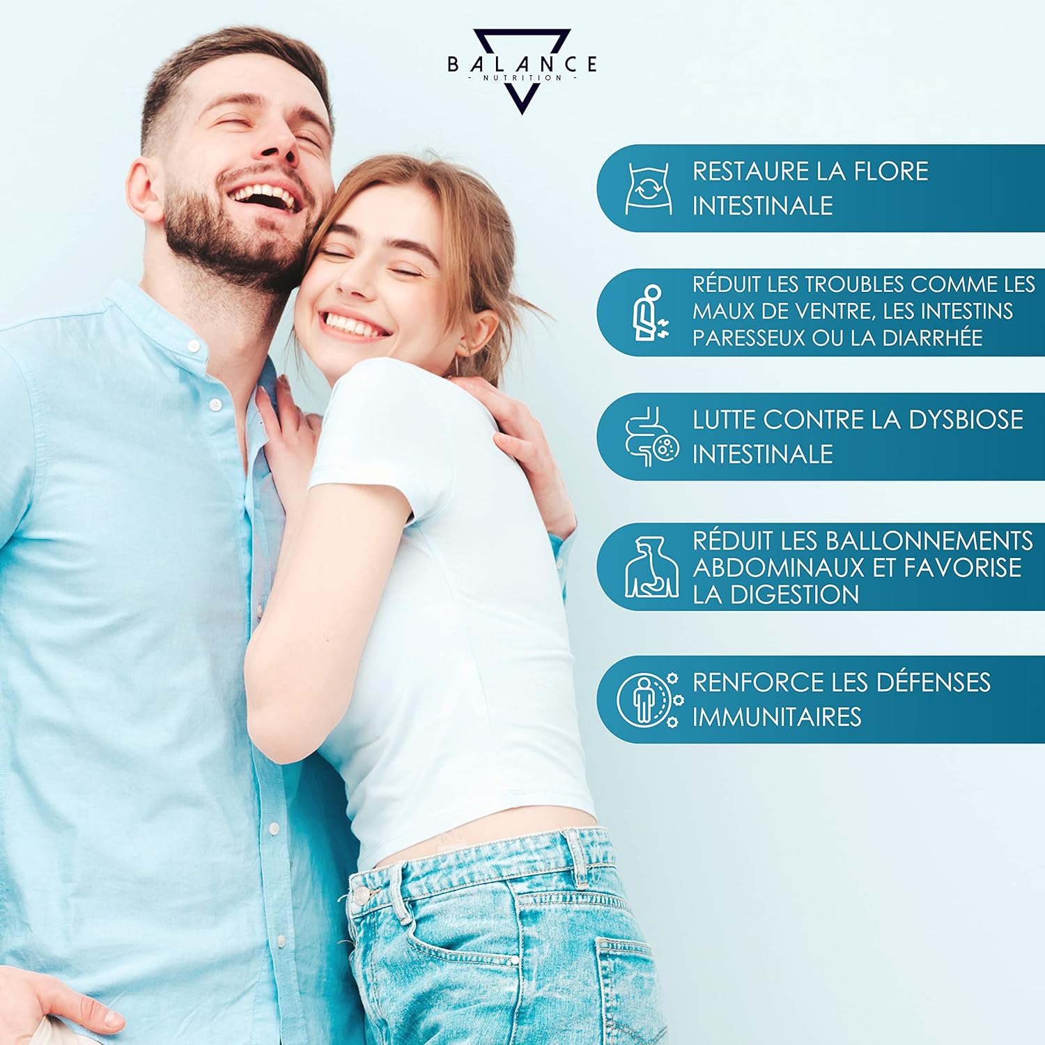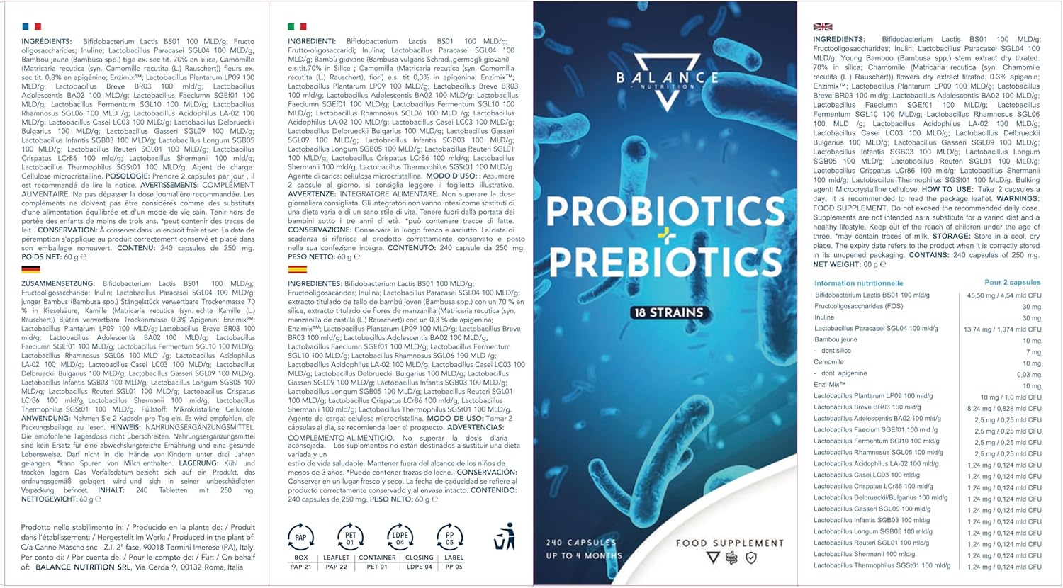 Complete probiotics + prebiotics: Our Balance Nutrition supplement contains up to 20 billion CFU per daily dose of the 18 main probiotic strains, including Lactobacillus, Bifidobacterium and Acidophilus. In addition, we added two very important prebiotics: inulin and FOS, which are essential for the growth of the gut microbiota and for a strong and healthy gut bacterial flora!