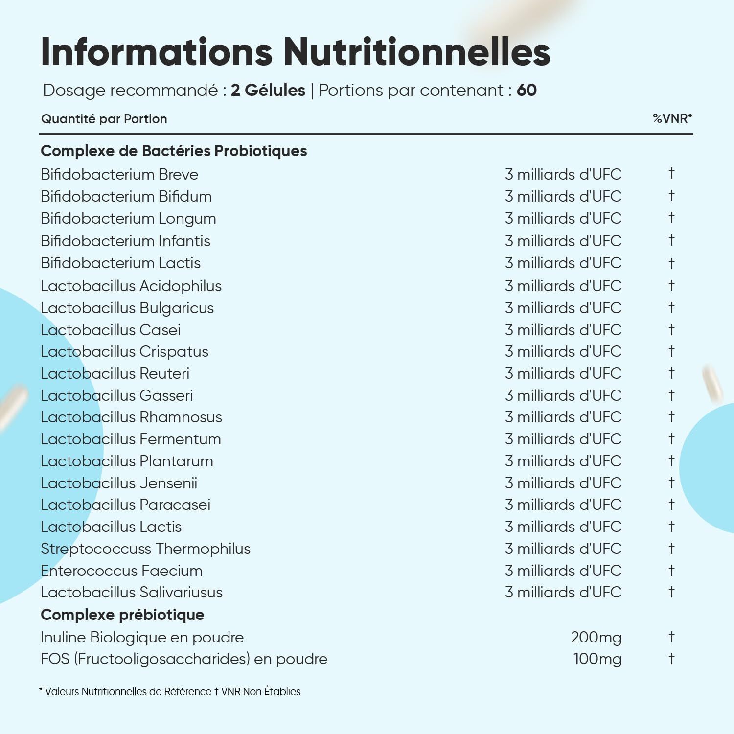 Lactic synergy and prebiotics – The vegan probiotic formula contains lactic ferments and prebiotic fiber. These include inulin, derived from chicory root, and FOS, found in garlic, onion and some vegetables such as asparagus and bananas, which work together with probiotics as part of a daily routine.