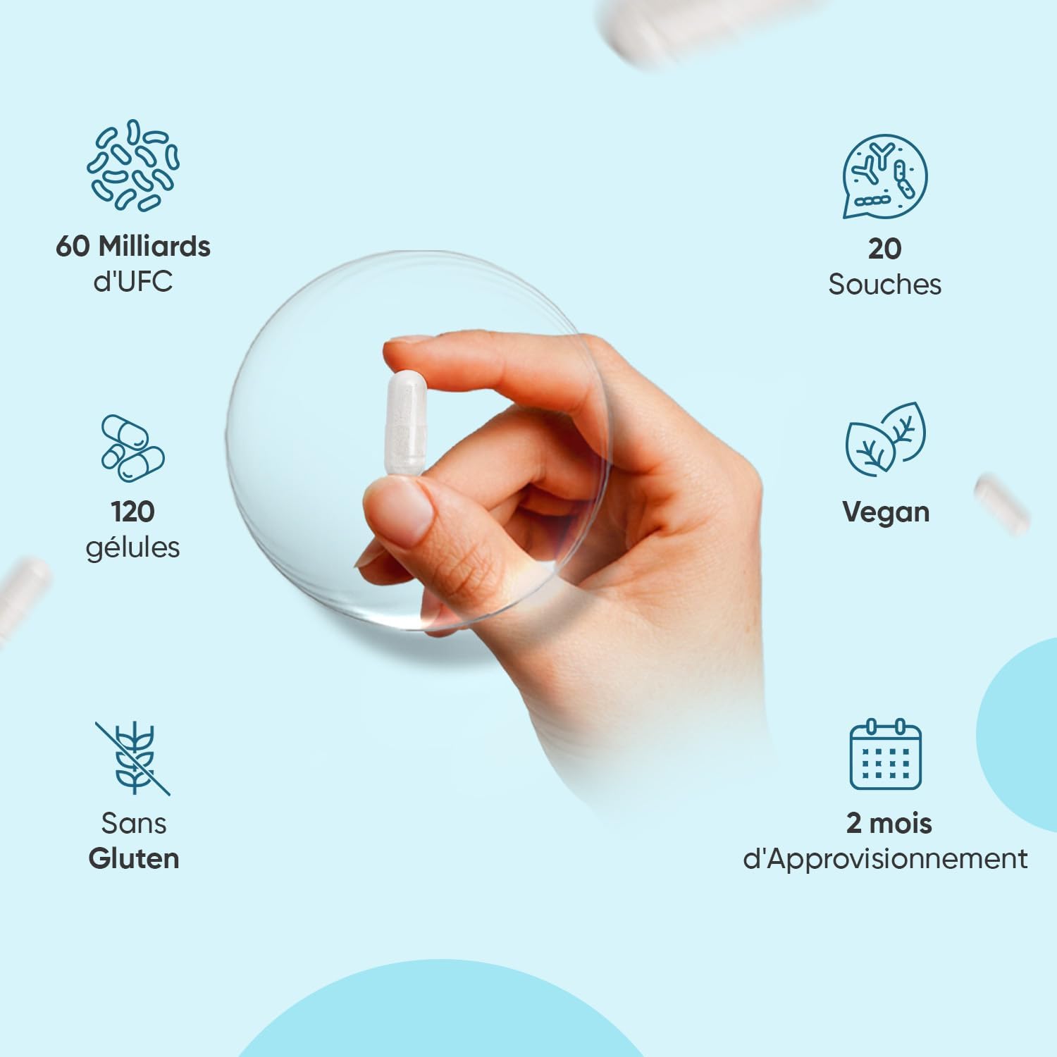 Properties – Each strain integrated into the vegan probiotic complex has been selected for its particular characteristics. The composition of probiotic and prebiotic capsules can be influenced by the number of strains present and the dose provided. Probiotics contribute to the balance of the intestinal flora (Probiotic intestinal flora).