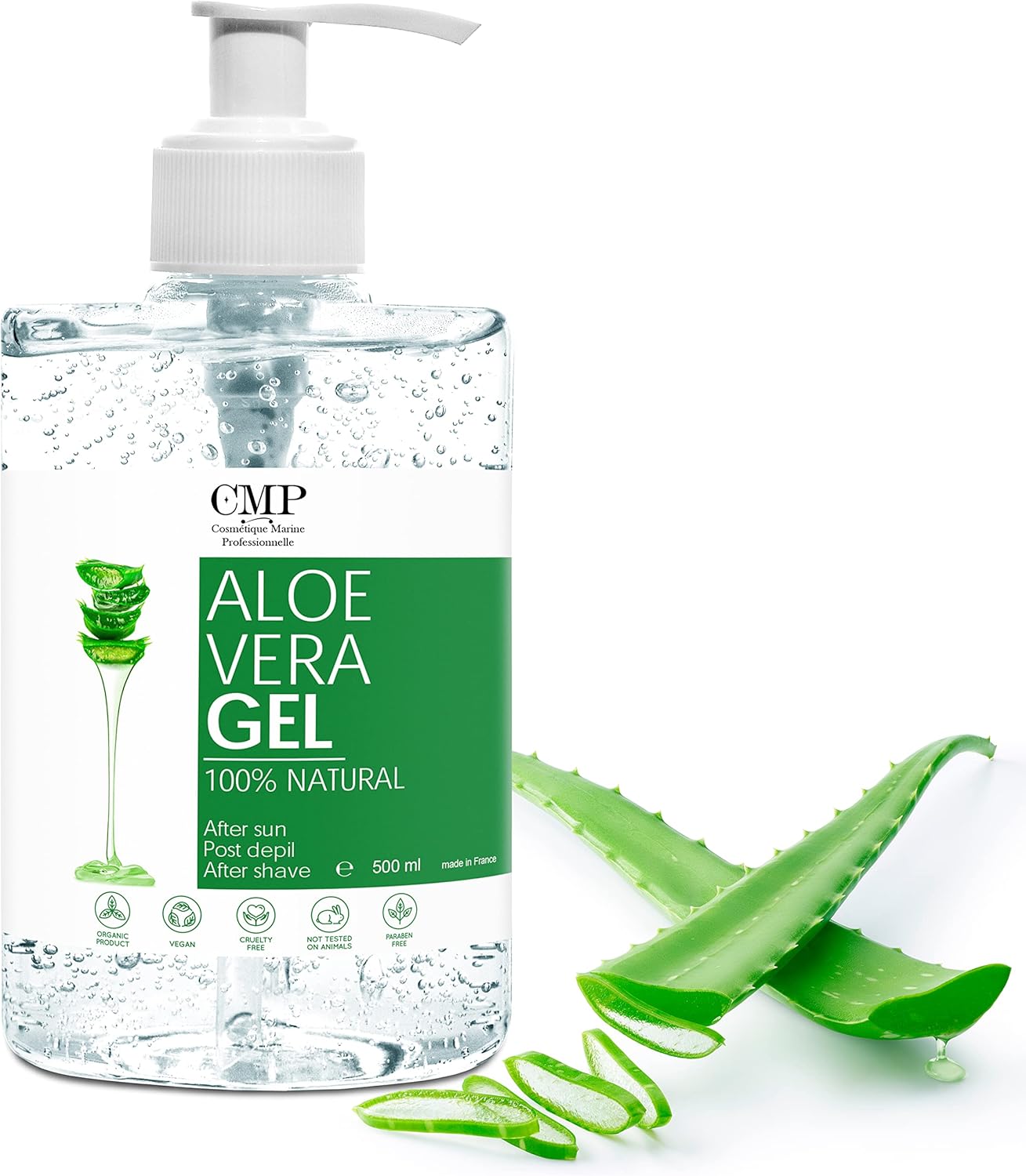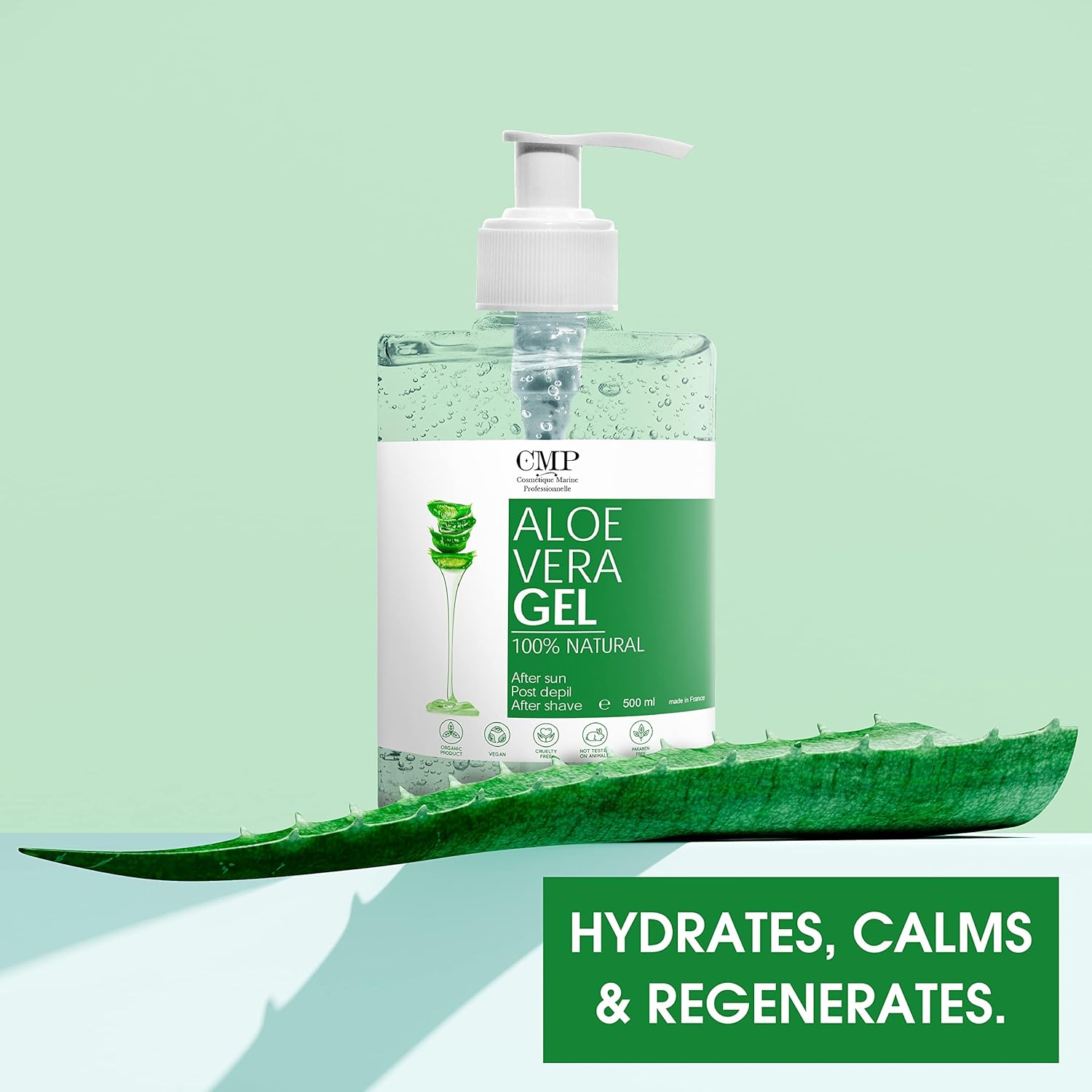 Flacon transparent de gel d'aloe vera CMP affiché sur fond vert avec la végétation des îles Canaries, mettant l'accent sur les ingrédients naturelsFlacon transparent de gel d'aloe vera CMP affiché sur fond vert avec la végétation des îles Canaries, mettant l'accent sur les ingrédients naturels