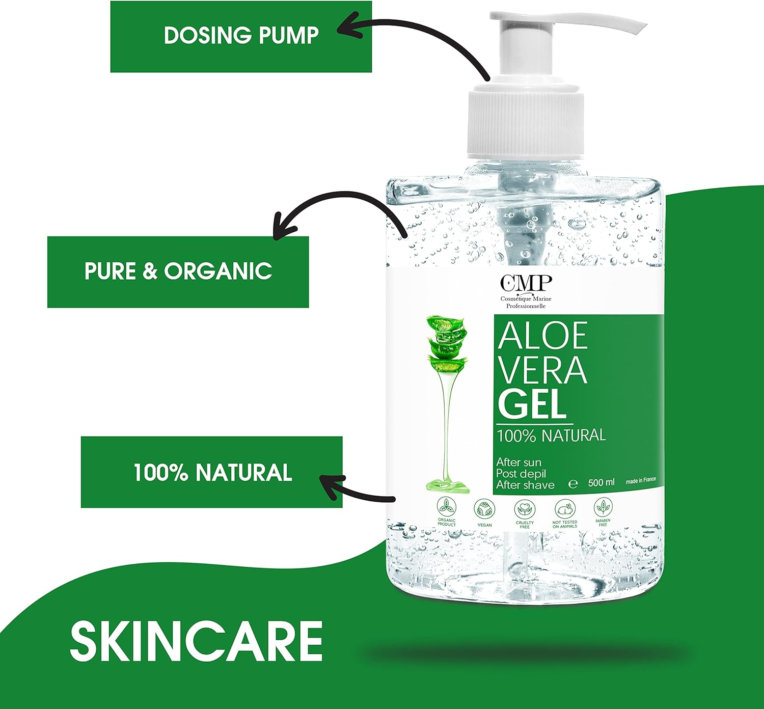 Flacon pompe transparent de gel d'aloe vera avec étiquette verte. Des feuilles d'aloe vera fraîches sont visibles à côté du flacon sur fond vert.Flacon pompe transparent de gel d'aloe vera avec étiquette verte. Des feuilles d'aloe vera fraîches sont visibles à côté du flacon sur fond vert. 100% BIOLOGIQUE ET VÉGÉTALIEN Nouveau design avec DOSER !