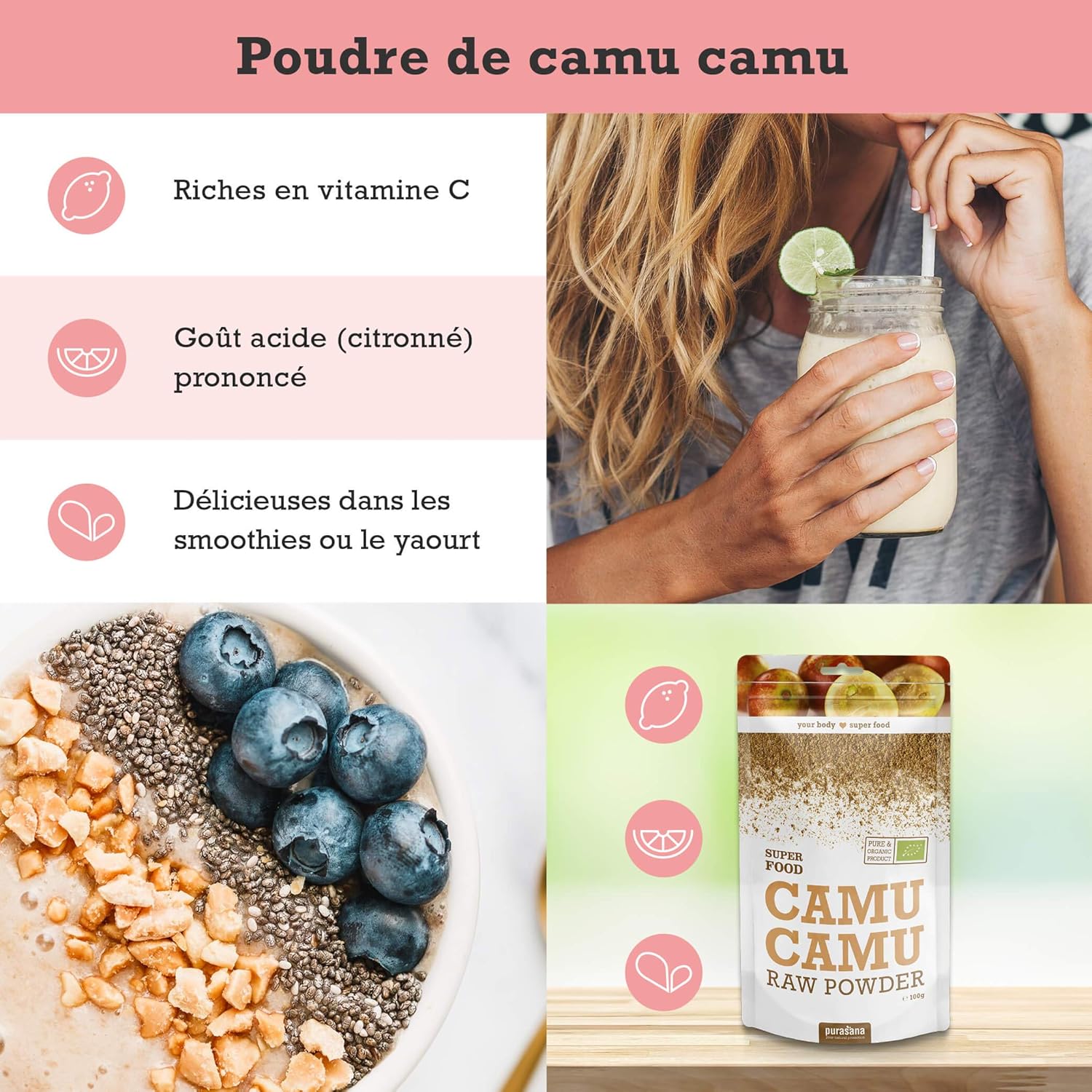 Les baies camu camu sont riches en vitamine C Goût acide (citronné) prononcé Délicieuses dans les smoothies ou le yaourt