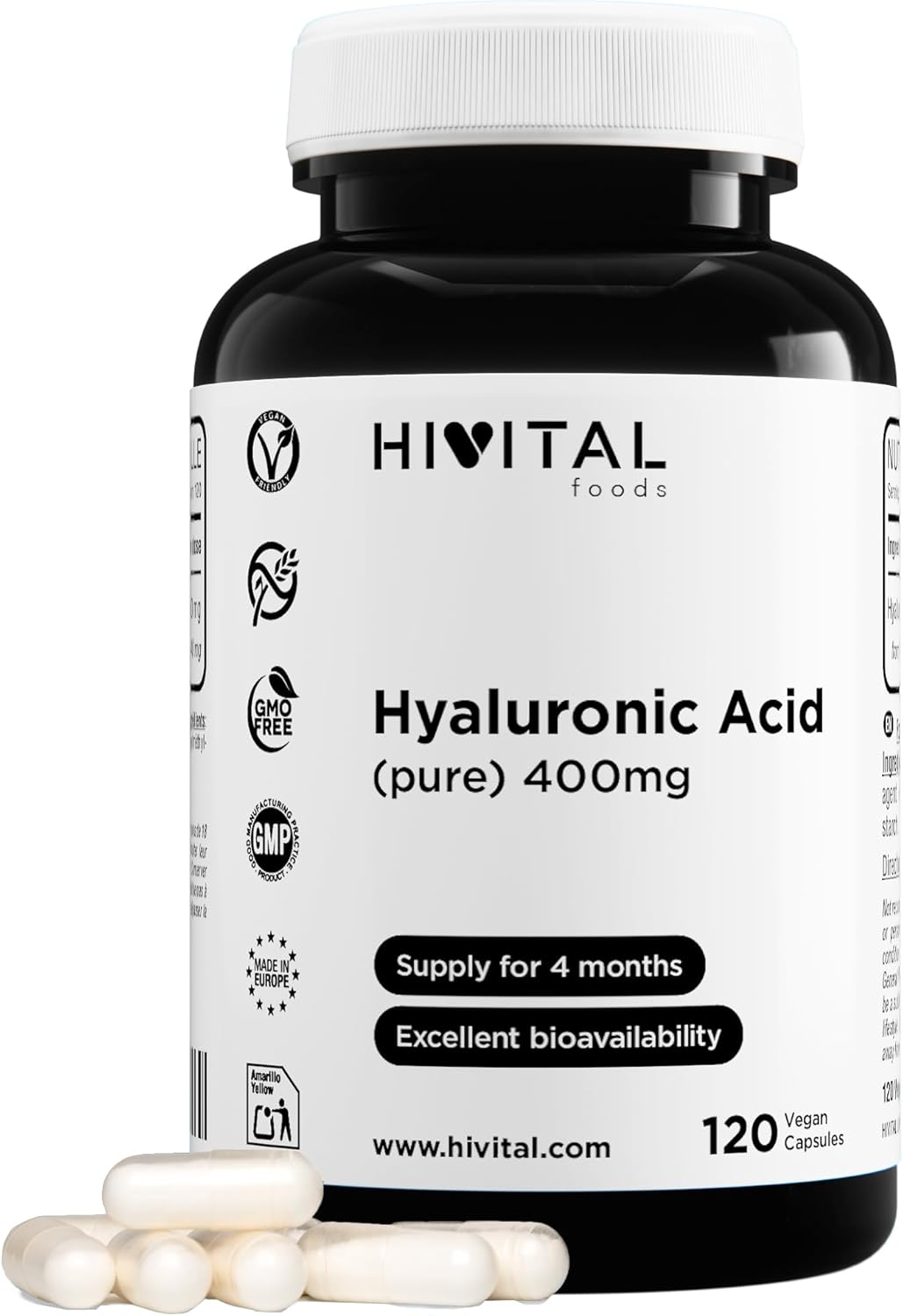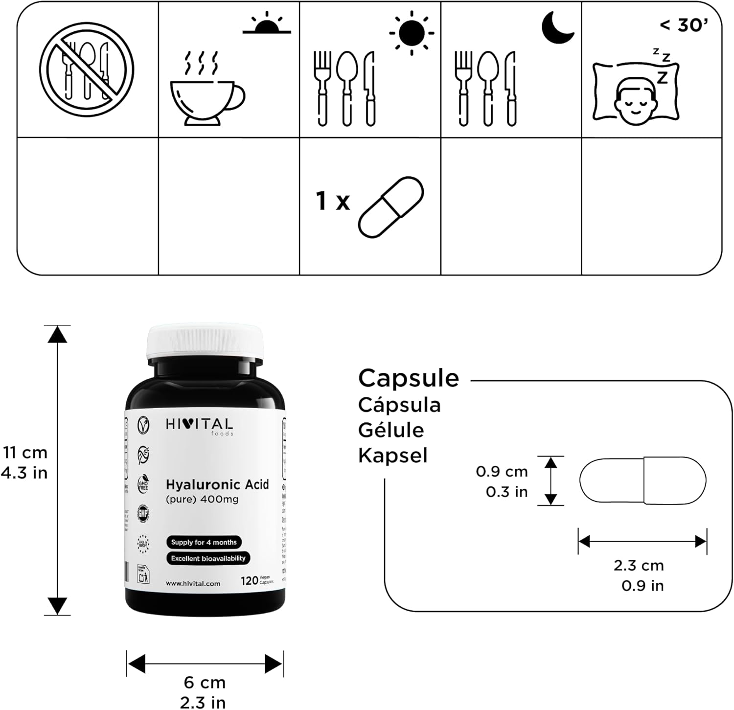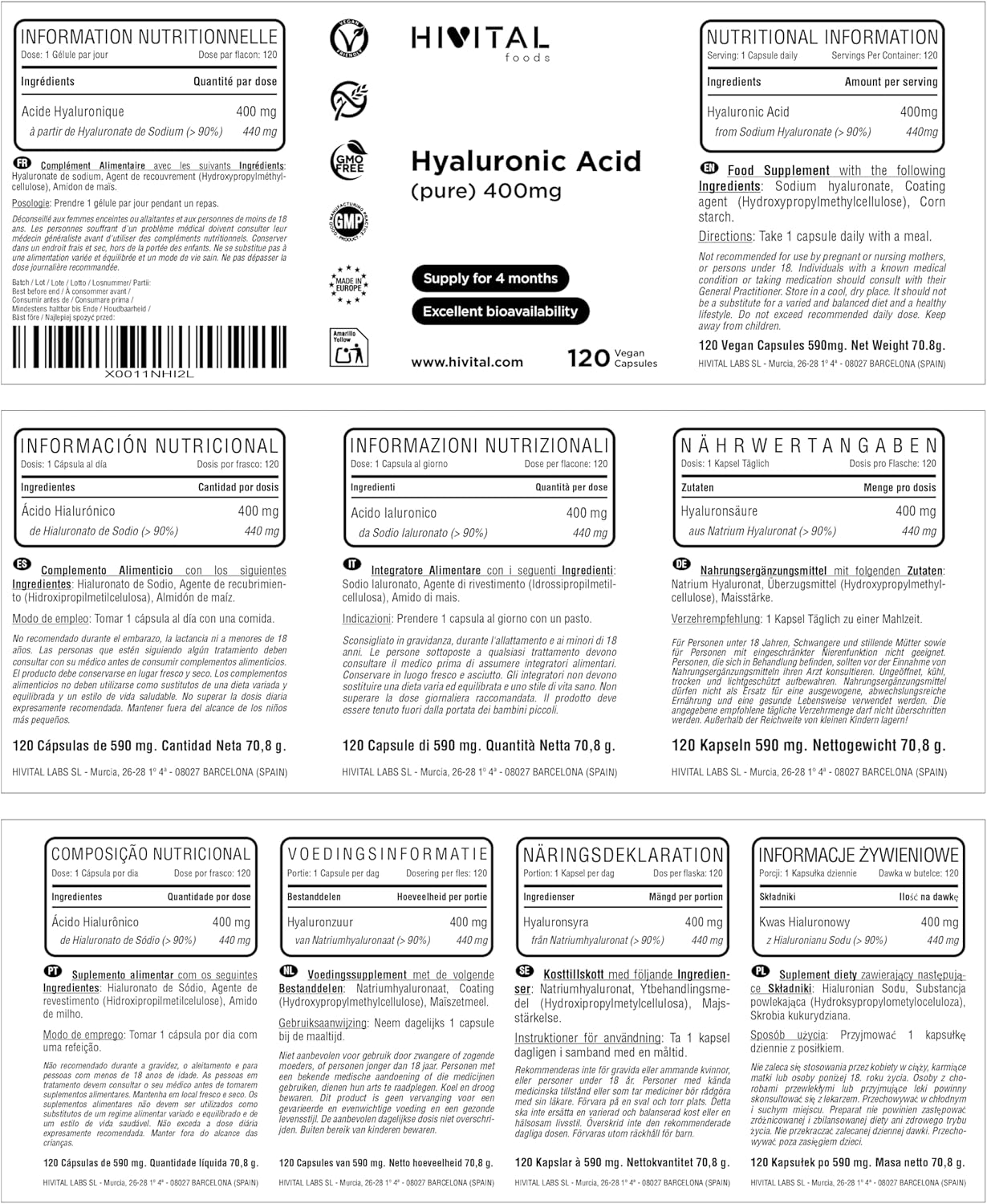 EXCELLENTE FORMULE à base d’Acide Hyaluronique végétalien de pureté et de biodisponibilité maximales issu de la culture bactérienne. GRANDE QUANTITÉ DE GÉLULES DANS CHAQUE BOÎTE: Nous offrons 120 gélules végétaliennes par bouteille, 4 mois d’approvisionnement.LE MEILLEUR ACIDE HYALURONIQUE: Composé à 90% d’Hyaluronate de Sodium fournissant 400 mg d’Acide Hyaluronique pur de la plus qualité et de poids moléculaire élevé (800 – 1500 kDa), similaire à celui généré naturellement par notre organisme. Ainsi, notre produit garantit une biodisponibilité, une absorption et une efficacité optimales. POSOLOGIE : Prendre 1 capsule par jour avec un repas.NOUS N’UTILISONS PAS de Stéarate de Magnésium ni aucun type de Dioxyde ou de Produit Chimique, additifs peu recommandés utilisé dans les compléments alimentaires d’autres marques.QUALITÉ ET QUANTITÉ MAXIMALES: Notre produit est 100% vegan, sans gluten, sans lactose, sans stéarate de magnésium, sans sucre, sans conservateur ni colorant, sans arôme ajouté, non transgénique (sans OGM).FABRIQUÉ EN EUROPE selon les bonnes pratiques de fabrication (GMP en anglais) et ISO. Hivital Foods est enregistré au AESAN sous le numéro 26.019181B.EBOOK CADEAU: Lorsque vous achetez notre produit, nous vous enverrons en cadeau notre ebook (en PDF) sur l’Acide Hyaluronique, et vous découvrirez toutes ses propriétés et tous les bienfaits qu’il apporte à votre santé.