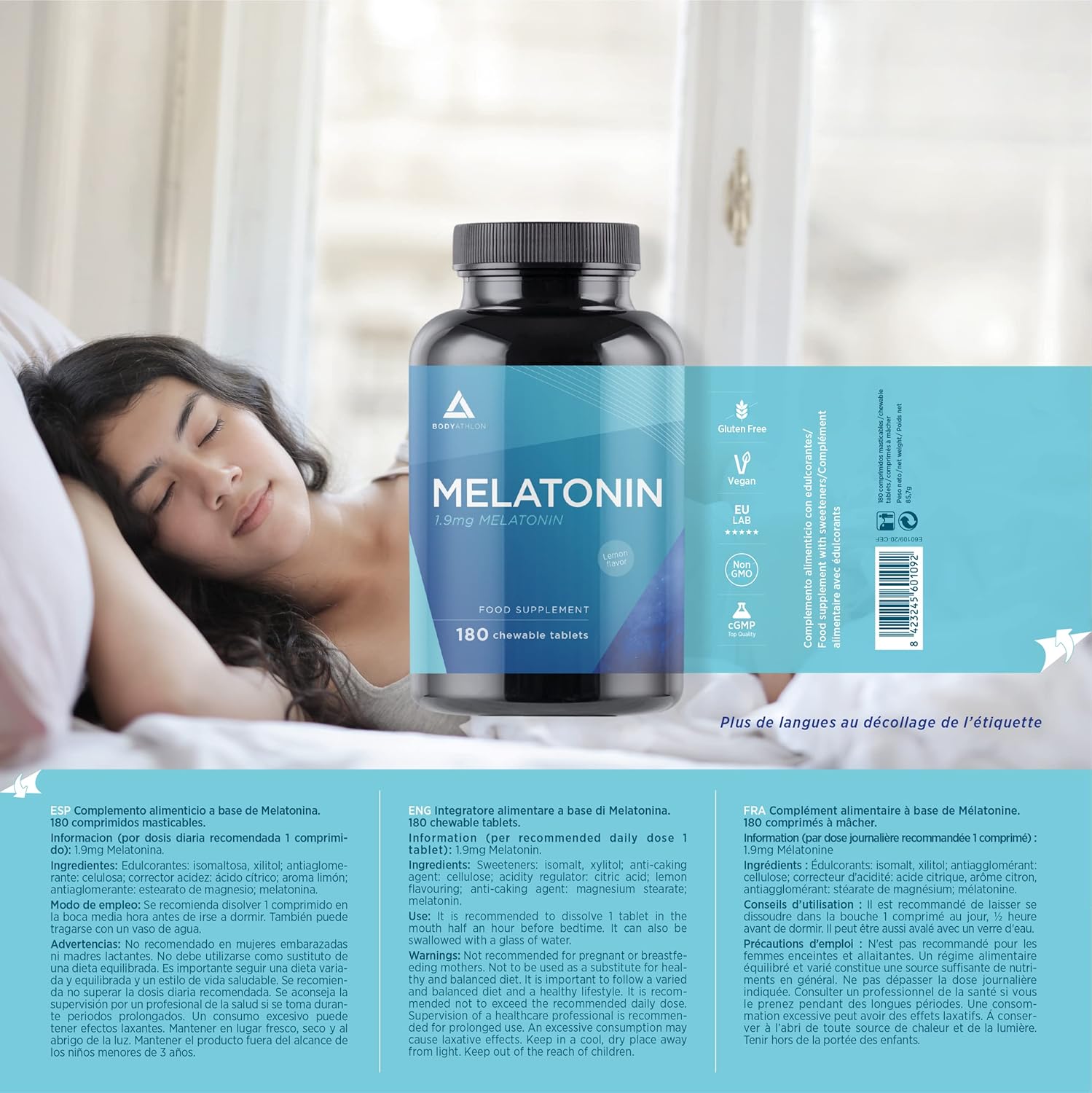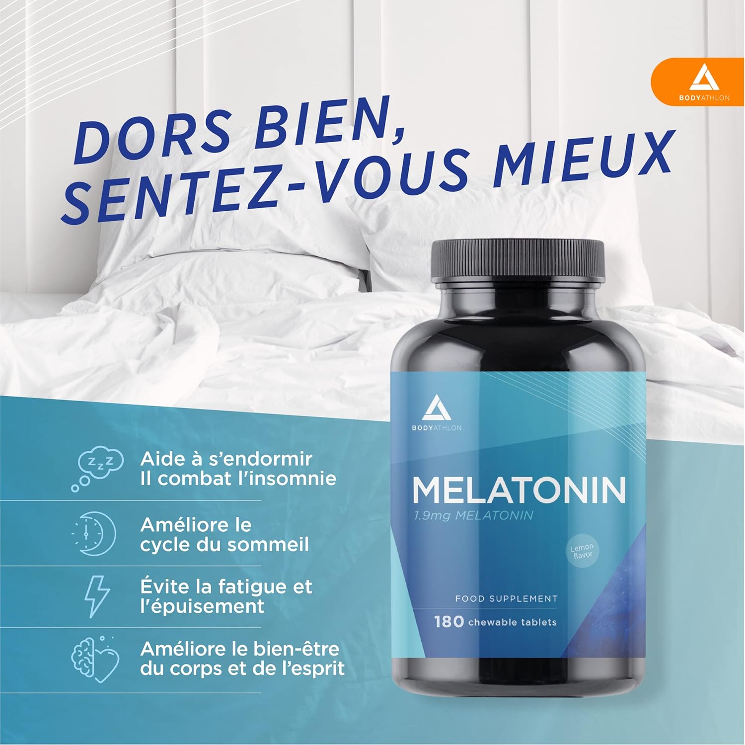HIGH CONCENTRATION OF MELATONIN. Melatonin from Bodyathlon contains 1.9mg of melatonin per tablet. Is perfect for reducing the time it takes to fall asleep and promotes a long lasting and prolonged rest. Lemon sublingual melatonin.