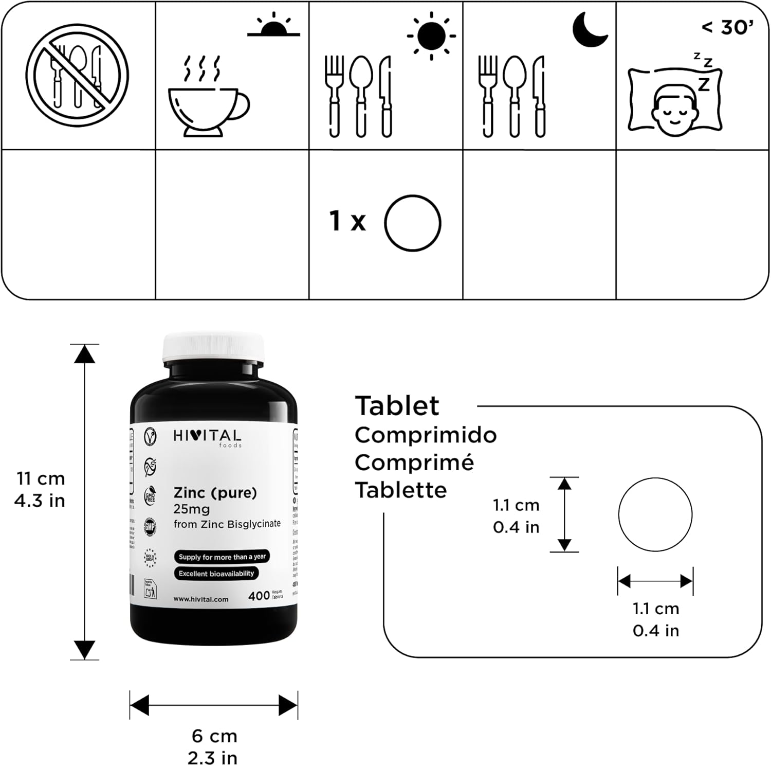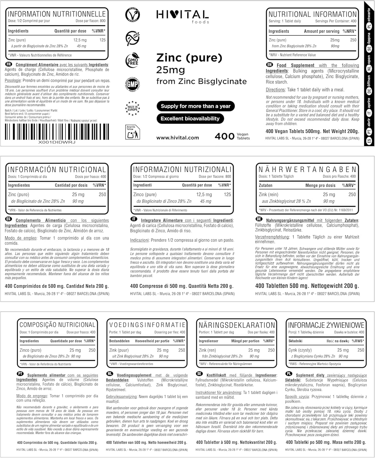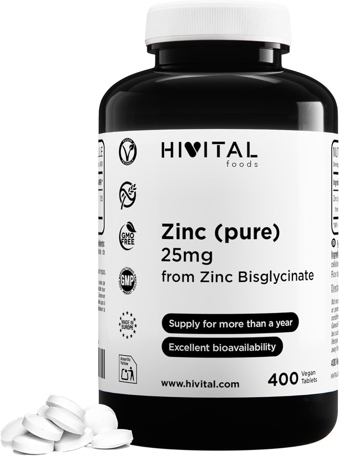 Pure Zinc 25 mg Zinc Bisglycinate. 400 vegan tablets for over a year of treatment. Elemental of first quality. Made in Europe by HIVITAL
