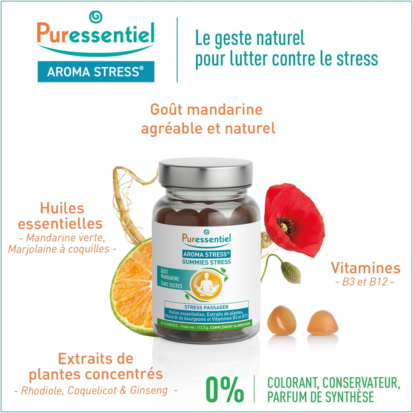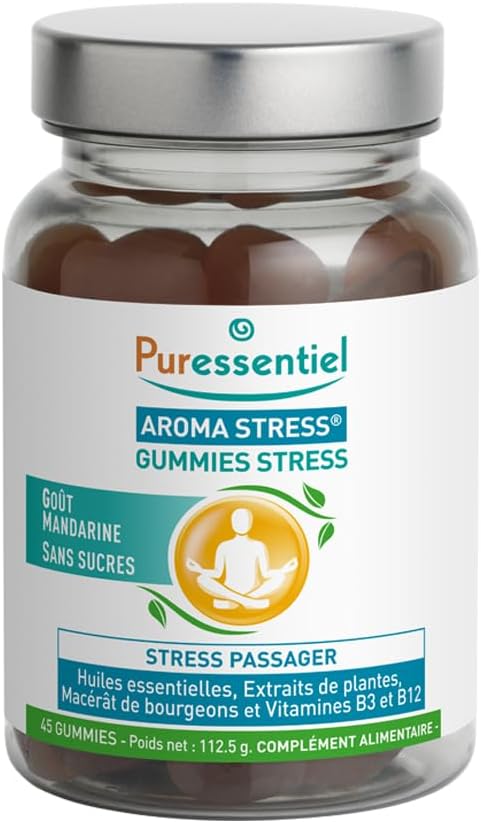 Passenger stress? Nervousness? Irritability? AROMA STRESS gummies contain an exclusive synergy of patented active ingredients combining BIO HEBBD essential oils, plant extracts (Ginseng, Rhodiol,Poppy), bud macerate with a vitamin complex (B3 and B12) to help reduce agitation states and improve concentration. Ideal for daily use and during situations of passing stress.Biochemically and Botanically Defined Essential Oil 45 gummies with mandarin taste with a pleasant tangerine taste without sugars, gelatin, gluten free and without synthetic aroma. Vegan and non-cariogenic for ages 15+. Food supplementAROMA STRESS: The first natural STRESS range with exclusive synergies of active ingredients adapted to global care. From one-time stress with Gummies Stress and Inhaler Stress To Passenger Stress with Roller Stress and Oral SprayTo more lasting stress with the 15-day program Morning/Evening capsules DUO Stress +