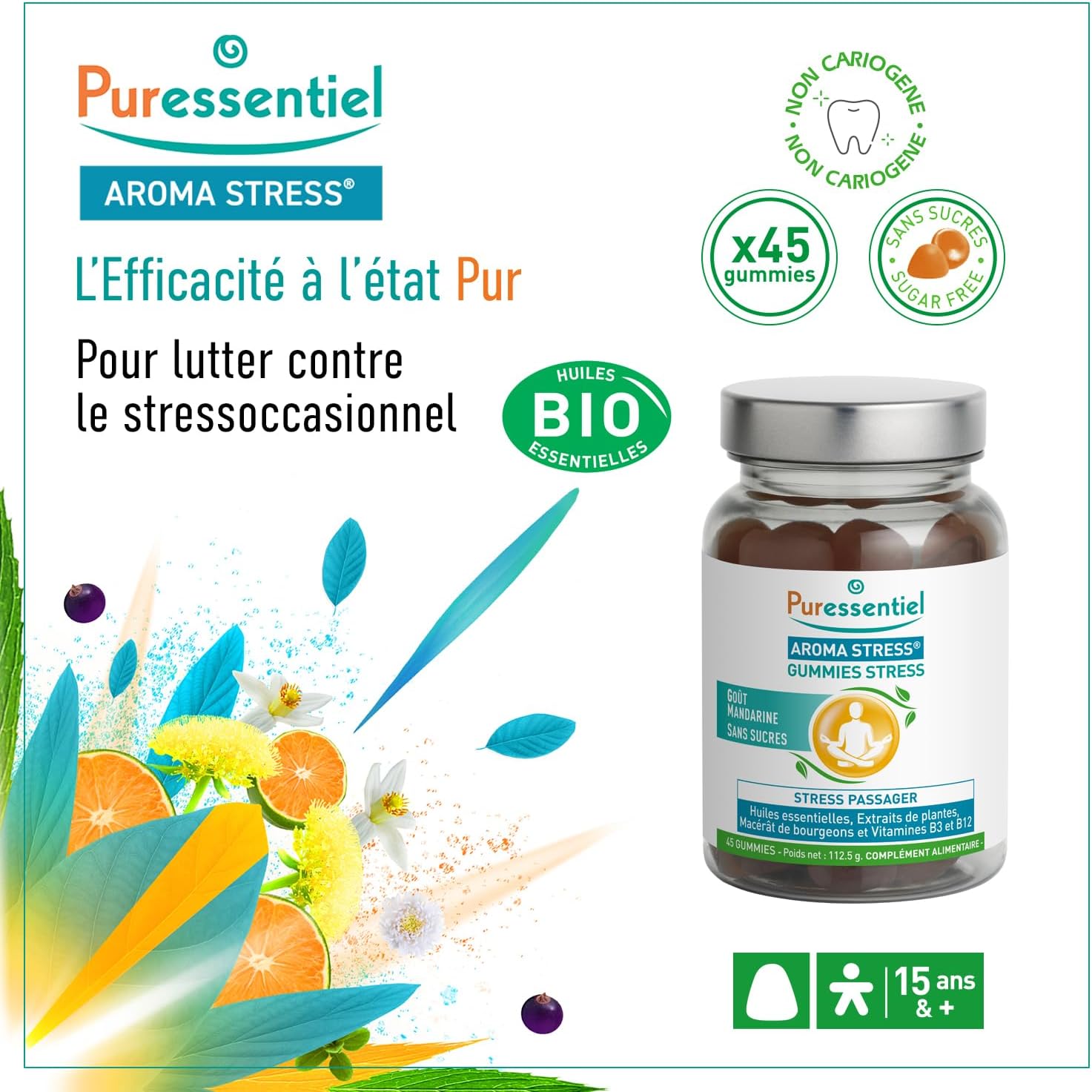 Puressentiel – Aroma Stress – Stress Gummies with Organic Essential Oils – Ginseng and Rhodiole Extracts Vitamins B3 and B12 – Promotes concentration and helps fight anxiety – 45 Gums