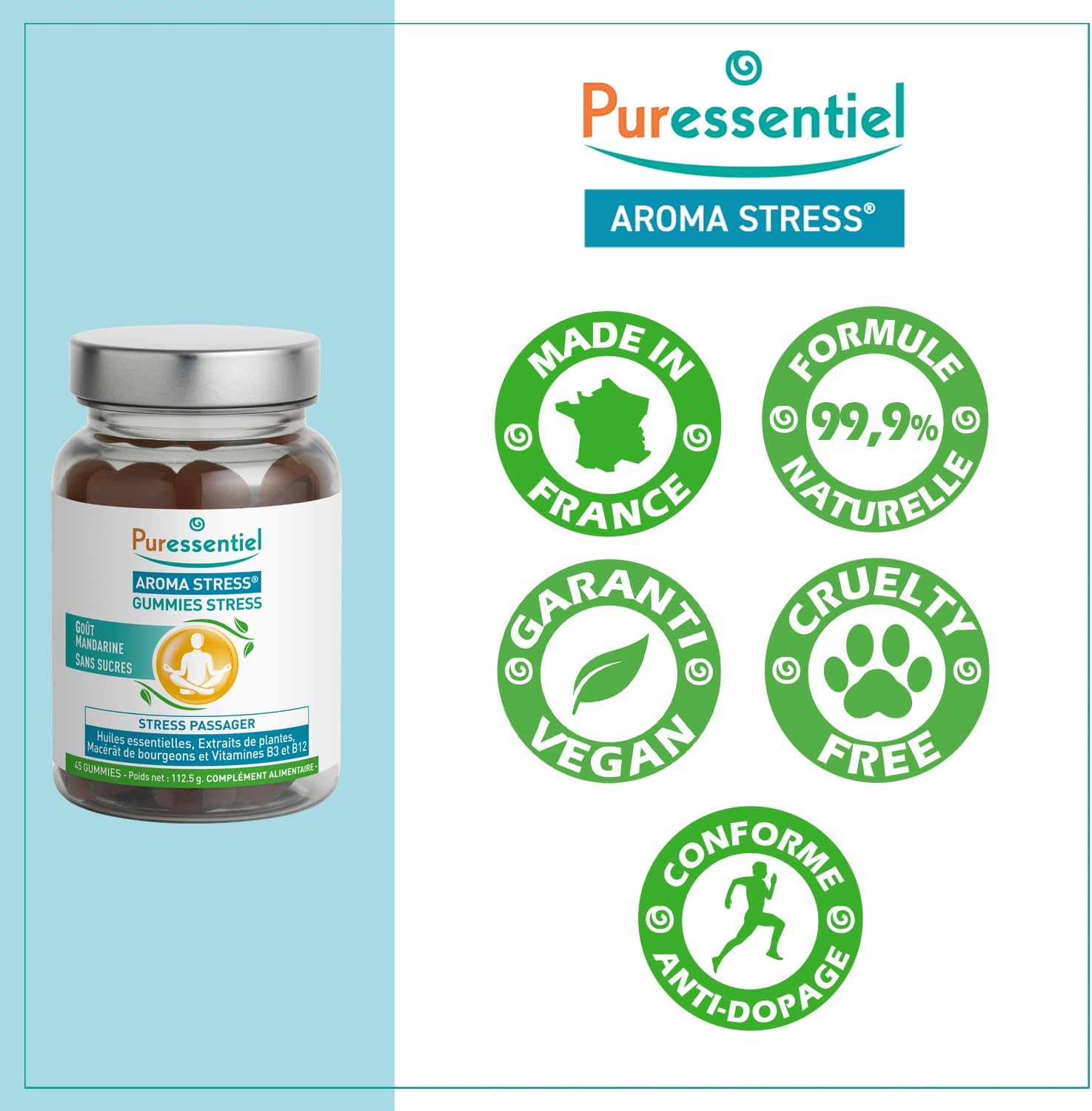 AROMA-STRESS: The new Puressentiel range with exclusive synergies of concentrated natural active ingredients for optimal efficiency. For global stress management – Without drowsiness, addiction or addiction – Made in France